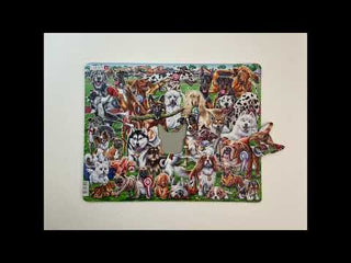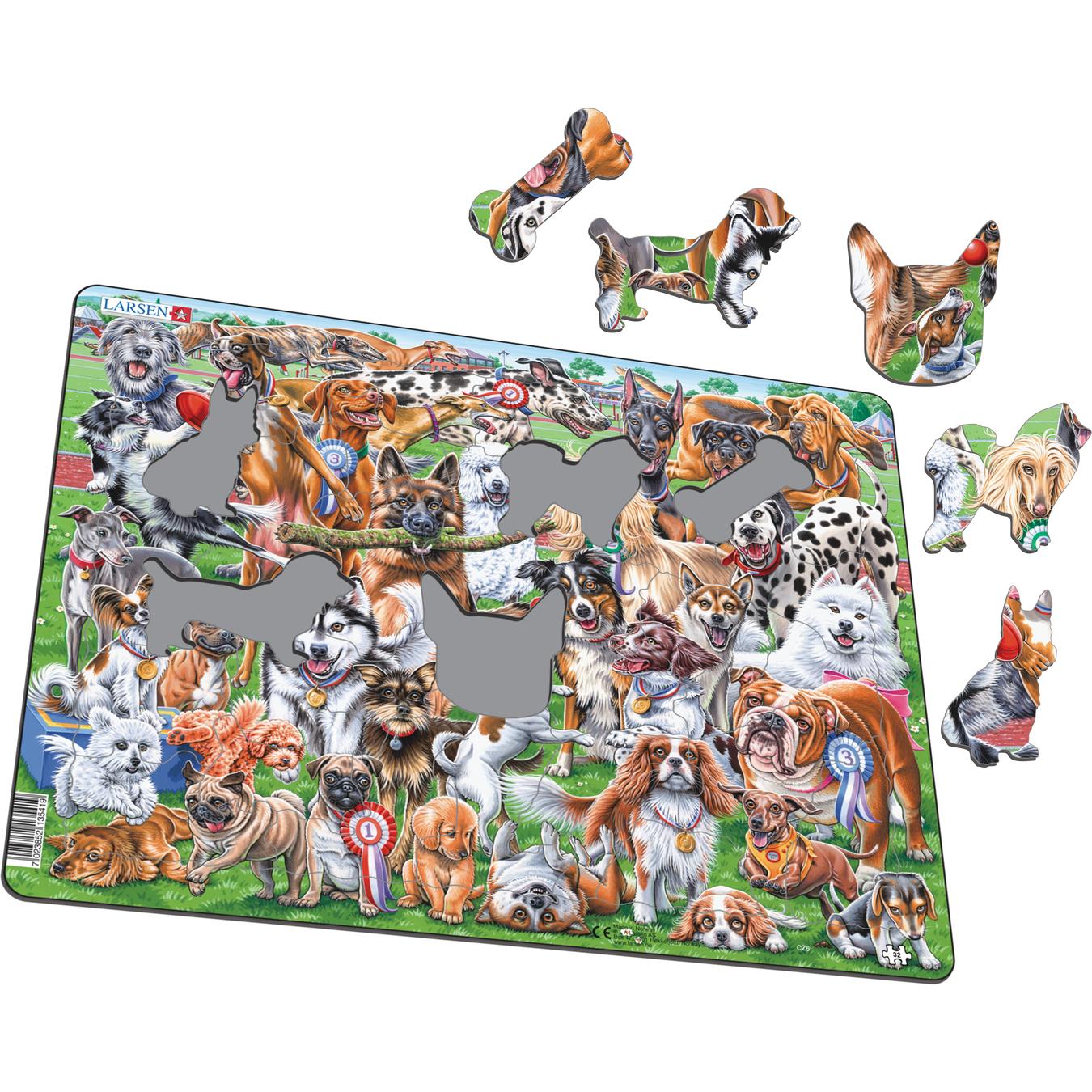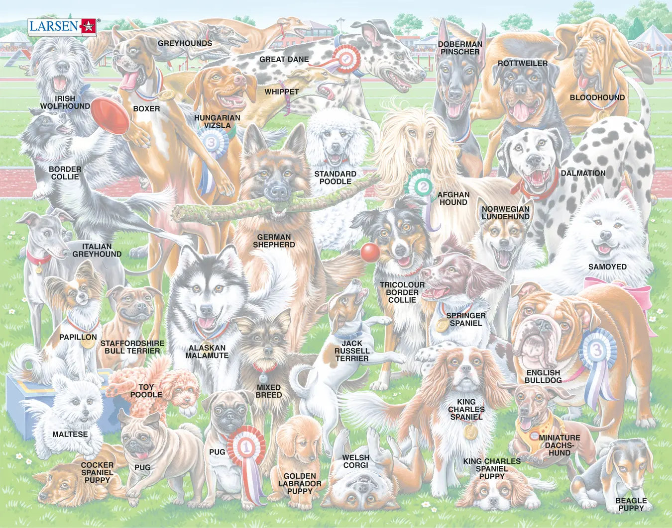Her er en gruppe søte og lekne hunder av mange forskjellige raser som poserer for fotografen. Ikke alle hundene klarer å stå stille. De har nettopp vært på en hundeutstilling, og noen av dem poserer stolt med rosetter de har vunnet. Border collien til venstre prøver å fange en frisbee, men andre hunder prøver også å gripe den. Noen av de 32 puslespillbrikkene er formet som hunder, et hundehode og et kjøttbein. Nesten alle hundene ser glade ut, bare noen valper nederst ser litt triste ut. Dette puslespillet passer for mindre barn, men hundeelskere i alle aldre vil like å studere den fantastiske illustrasjonen med alle de vakre hundene.