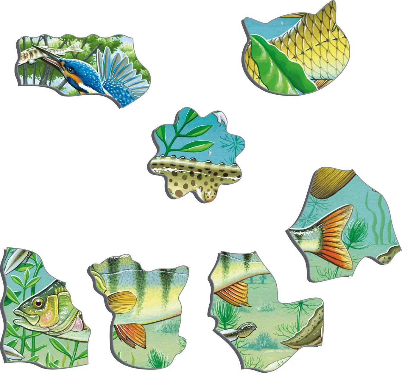 Dykk ned eller padl om bord i dette eviggrønne vanndam-puslespillet. Dette undervannspuslespillet har 50 mindre brikker i en rekke former. Noen av de vannlevende artene inkluderer en gråhegre som desperat klamrer seg til en ål, sprukne piletrær og or, en fokusert isfugl som leter etter lunsj, en båndet agrion-nymfe, brunørret som fanger en døgnflue, en stor toppsalamander, en hannlig sivhøne, fantastiske store damsnegler, hann- og hunnstingsild, en keiserøyenstikker, muggen mygglarve, en stor dykkerbille, små rumpetroll, vrikkende vannlopper, en vannmark, en karpe, blodsugende igler, en dabbende and, brytende virvelbiller, en pen abbor, mystiske minnows, en flagrende frosk, omgitt av typiske damfråmler, en vakker gul vannlilje, hornurt, damsnute, vannstjerneurt og rikelig med alger. Dette pedagogiske puslespillet vil få barna dine til å mestre vannlevende mesterhjerner på kort tid! Perfekt for eldre barn, spesielt de som er interessert i vannlevende organismer.