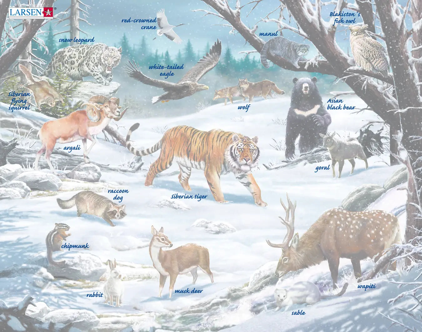 Dette puslespillet om dyreliv i Sibir og Det fjerne østen har 18 forskjellige dyr, inkludert et sibirsk flygeekorn klart til å treffe isen, en hvit og svart snøleopard som brøler like høyt som ulver, en japansk trane (fugl), en havørn, en ulv, en villkatt (manul), en fiskeugle (blakiston), fjellsau (argali) som står på en stein, en sibirsk tiger som selvsikkert går gjennom isen, en asiatisk svartbjørn som funderer på hva den skal gjøre, en goral som plasker forsiktig gjennom knust is, en sibirsk jordekorn som er fascinert av sine følgesvenner, en vaskebjørnhund som ser etter sitt neste eventyr, en fjellhare som står høyt, en moskushjort, en liten hvit russisk sobel og en wapiti. Noen av puslespillbrikkene er passende formet som ender, en gris, et busketekorn, en hval og en katt. Komplett med 66 brikker, passer dette puslespillet best for eldre barn.