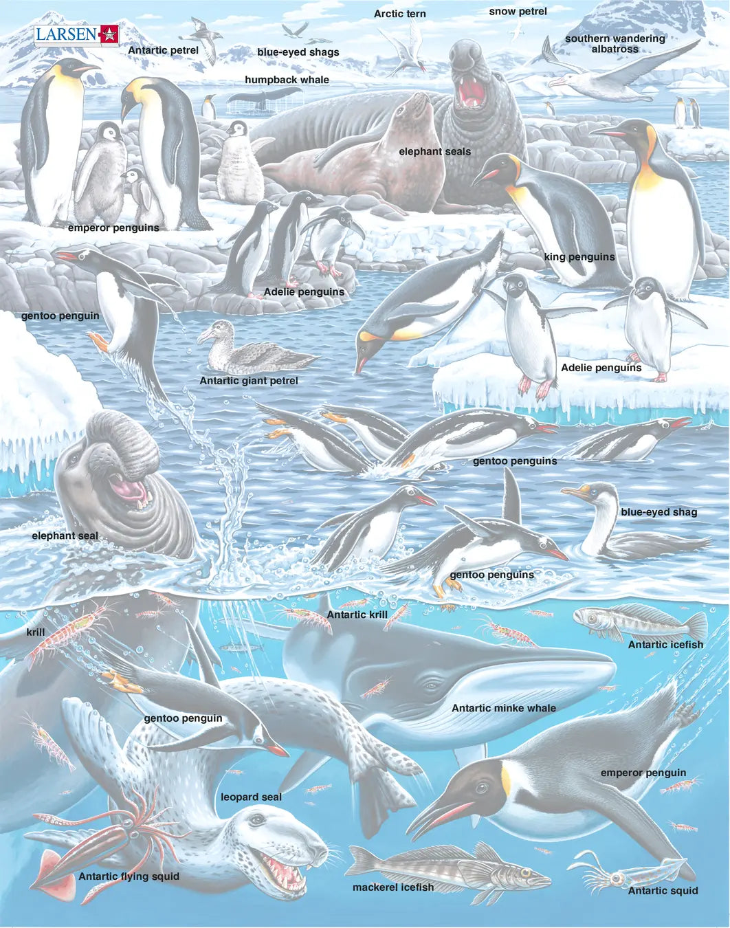 Antarktis er det kaldeste kontinentet på jorden. Havet rundt Antarktis er svært rikt på næringsstoffer, og små kriller lever her i svært store mengder. Krill er mat for kjempehvaler, fisk, seler og sjøfugler. En stor hval må spise mange små kriller for å bli mett. Pingvinene er de morsomste skapningene i Antarktis. I dette puslespillet finner du arter som Adelie, Konge, Keiser og Gentoo Pingviner. Dette er fugler som ikke kan fly, men bruker vingene når de dykker for å finne mat i det iskalde vannet. I puslespillet ser vi en del av det rike dyrelivet, også det som gjemmer seg i havet. Ser du selen svømme under vann? Det er en stor leopardsel på jakt etter mat. Mange av de 66 brikkene er formet som seler og pingviner, og puslespillet passer for litt eldre barn.