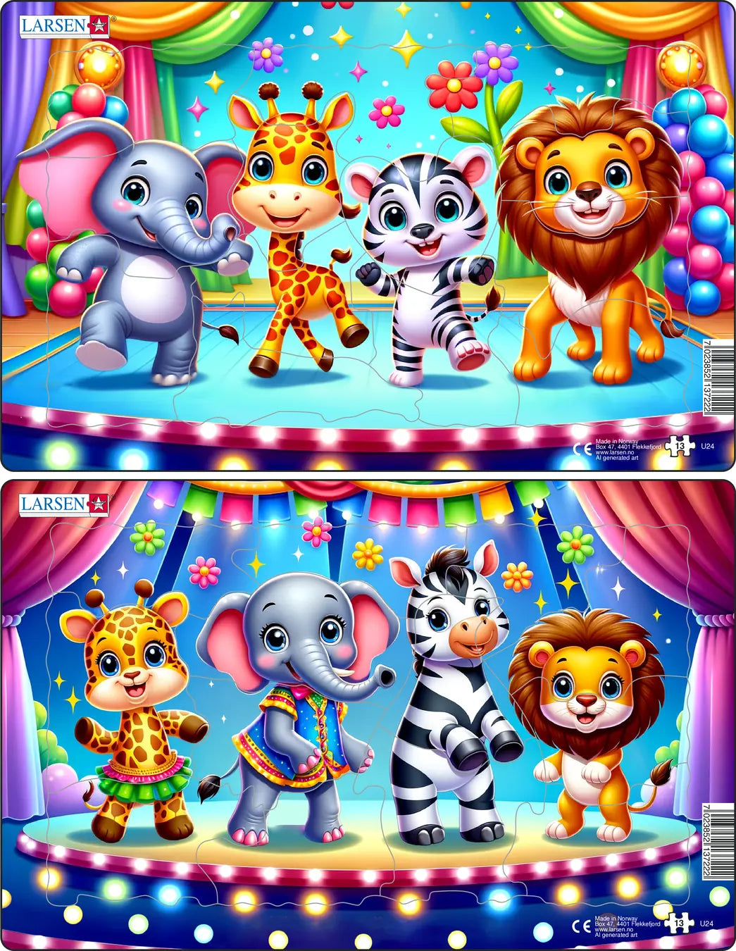 Sjiraffen Maria, elefanten Noah, sebraen Emma og løven Alexander danser på teaterscenen. Forestillingen har nettopp begynt, og nå er de litt nervøse, men de smiler og håper at alt skal gå bra.