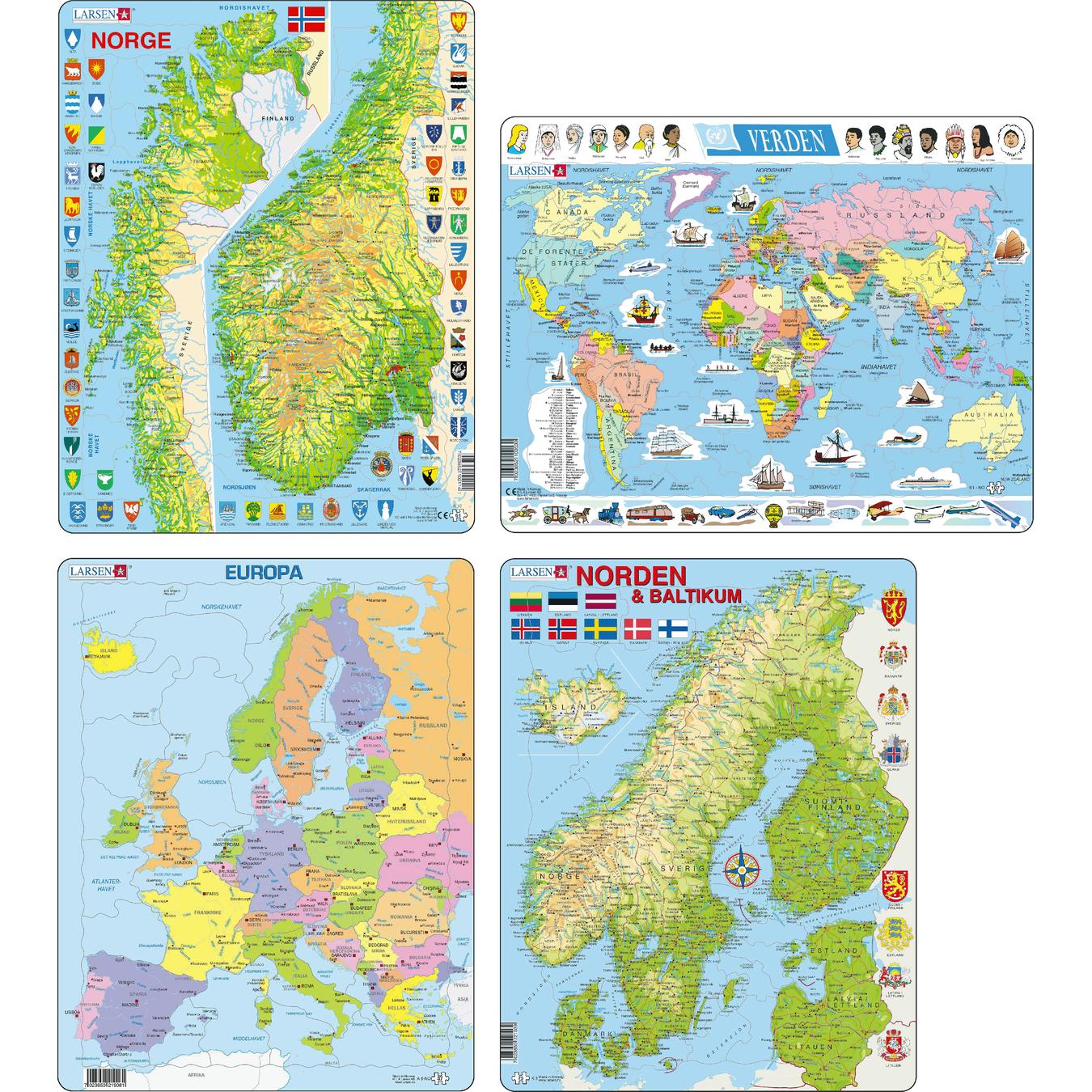 En pakke bestående av kart over Norge, Norden, Europa og verden. Settet inkluderer: Det nordiske Europa politisk Verdenspolitiske Norge
