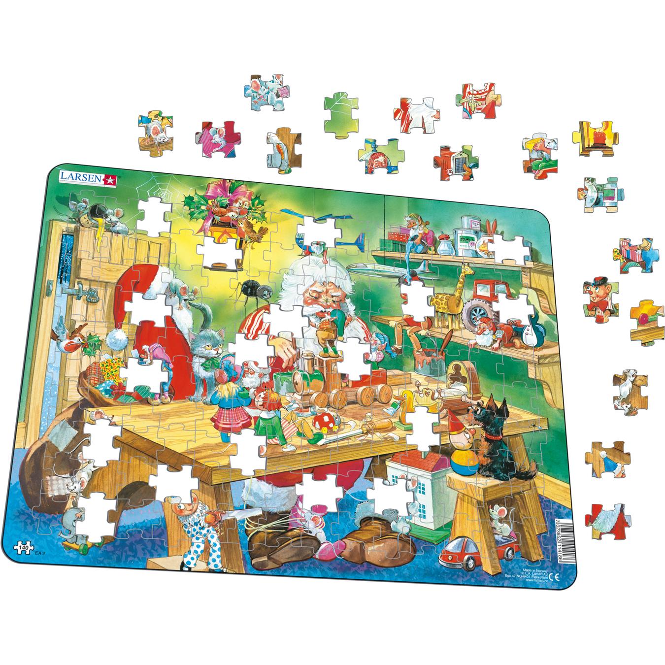 Julenissen jobber skikkelig hardt i sitt koselige verksted i dag. Han er ganske travelt opptatt med å lage leker til barn over hele verden. Alvene og skogsdyrvennene hans har også blitt med for å hjelpe. Et tretog er i fokus for julenissens oppmerksomhet mens mus piler rundt føttene hans. En alv laster innpakkede leker i julenissens sekk. Se opp, julenissen, et leketøy ser ut til å skjære inn i arbeidsbenken din! Julenissens hund og katt observerer ham mens han jobber mens en alv flyr over i et lekehelikopter. Med så mye moro som skjer rundt ham, hvordan får julenissen gjort alt arbeidet sitt?