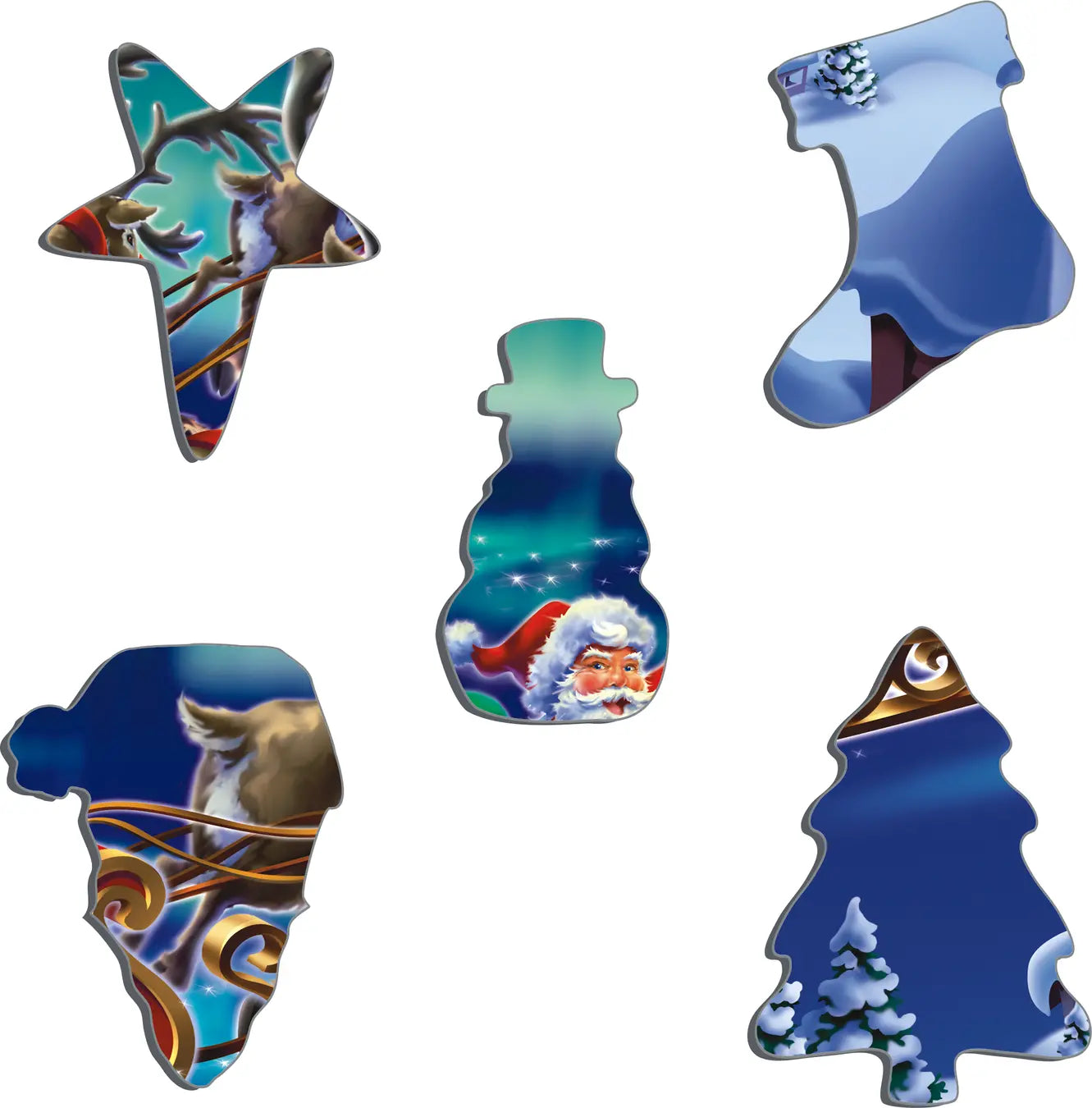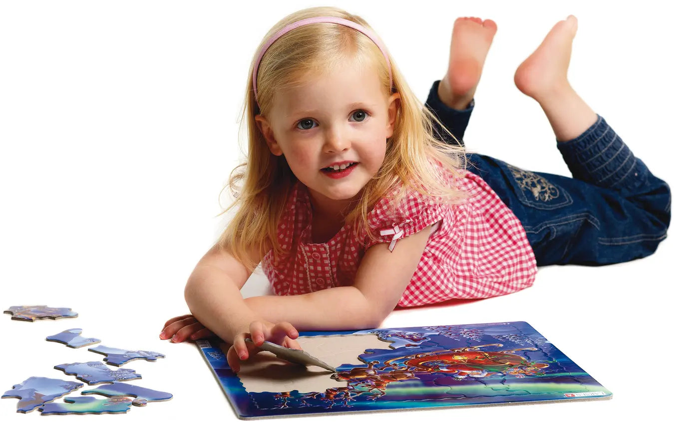 Dette livlige og opplysende puslespillet viser julenissen i sleden sin med reinsdyrene sine på julaften. Julenissens røde og gullfargede slede er fylt med leker til alle de snille barna, og han vinker farvel til sine små hjelpere. Han aker over alle hjemmene i Lappland, som er dekket av myk, hvit snø, mens nordlyset lyser og gløder på himmelen. Puslespillet leveres komplett med 26 større brikker, best egnet for de små hendene. Noen av puslespillbrikkene er nøye laget og kuttet til form som et juletre, julenissens sekk, en snømann, en stjerne, en slede, en strømpe og tre individuelle brikker som utgjør selveste julenissen.