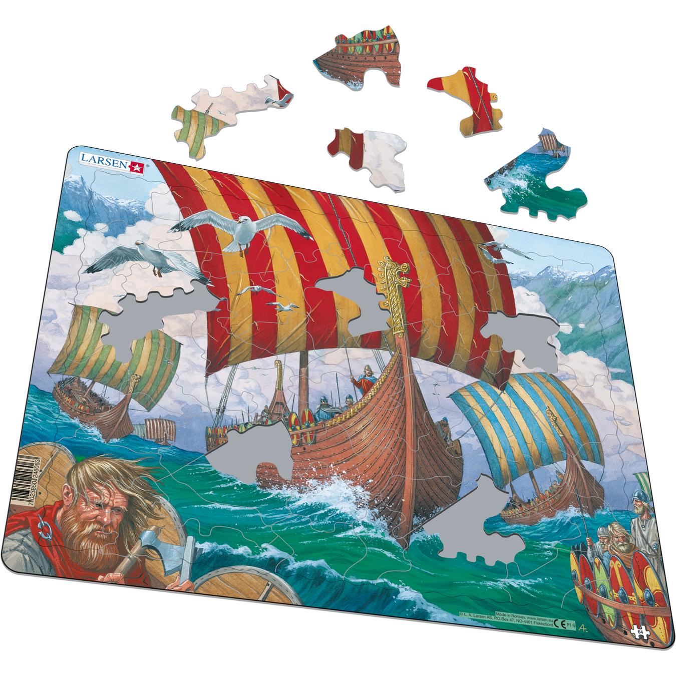 Vikingenes langskip var raskere enn alle andre båter på den tiden, de var bygget for å krysse store hav og de kunne seile oppover elvene. Her er Norges konge Olav Tryggvason på veg til Slaget ved Svolder, han tapte slaget hvor han ble drept i år 1000. Skipet hans het Ormen Lange og det var størst av alle vikingskip. Vikingskipene hadde praktfulle seil i fine farger, I vikingtiden var seilet viktig, og det kunne koste like meget som resten av skipet. Puslespillet med 64 brikker passer best for litt store barn.