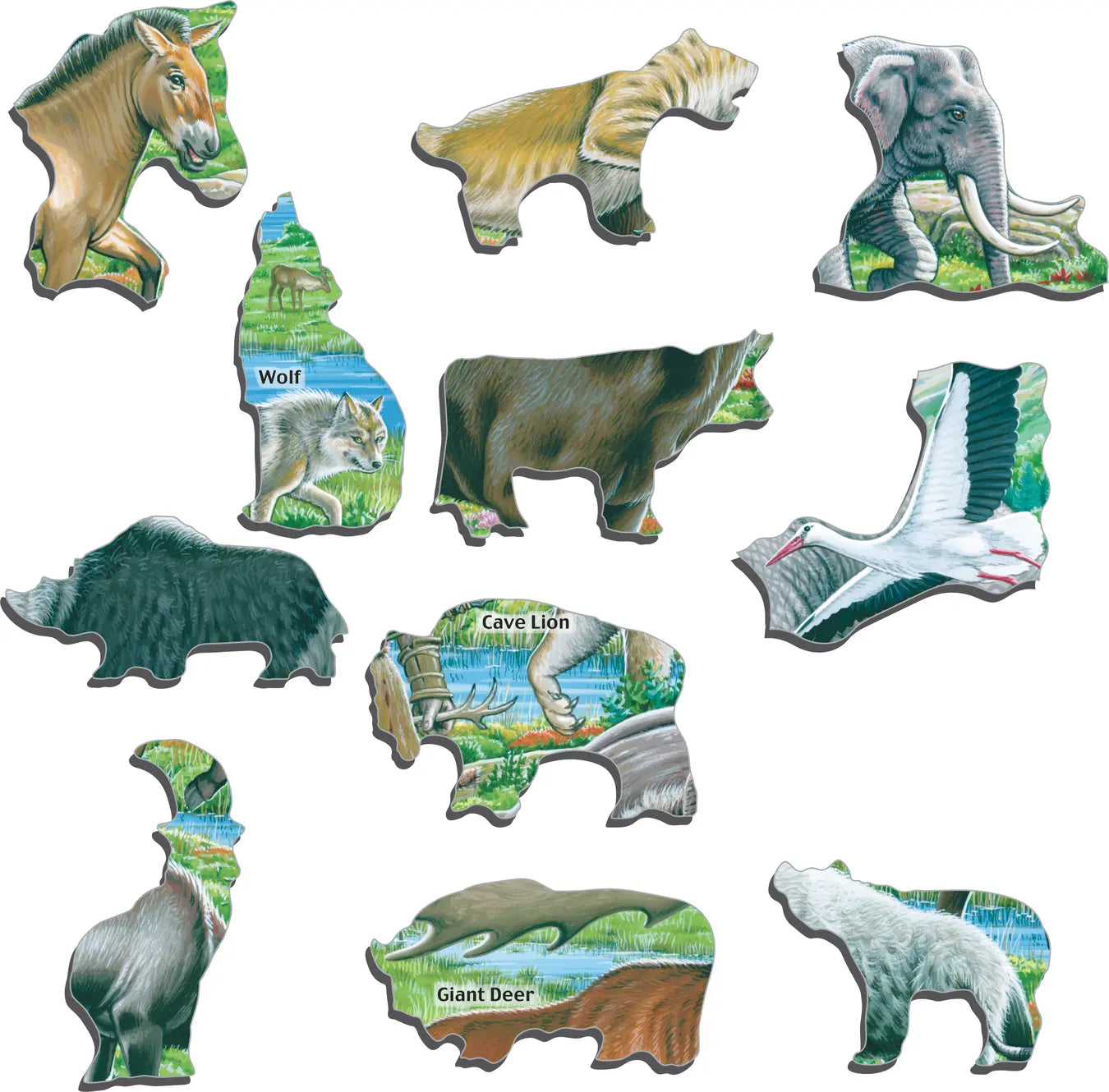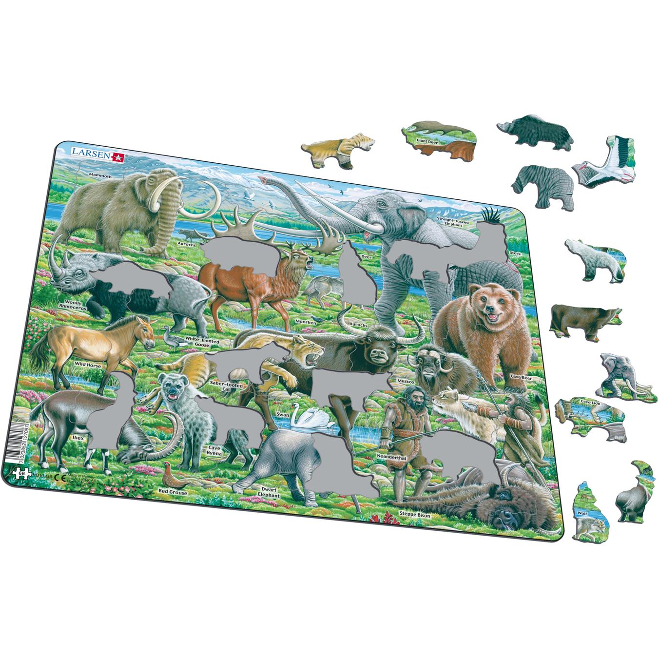 La oss gå tilbake i tid for omtrent 40 000 år siden, da neandertalerne streifet rundt med urgamle ville dyr. Du finner en mammut med lange støttenner, en elefant med rett støttenner, en sabeltannkatt, en ulv, en huleløve, en hest, en brun hulebjørn, en gigantisk hjort, en hvitpannet gås, en hulehyene, en steinbukk, en stork og en steppebison. Alle disse dyrene var til stede på neandertalernes tid. Dette fengslende puslespillet passer best for litt eldre barn og leveres komplett med 66 skreddersydde brikker. Noen av brikkene er nøye kuttet til form, som mange av dyrene på illustrasjonen. La oss finne ut hvilke du kan identifisere!