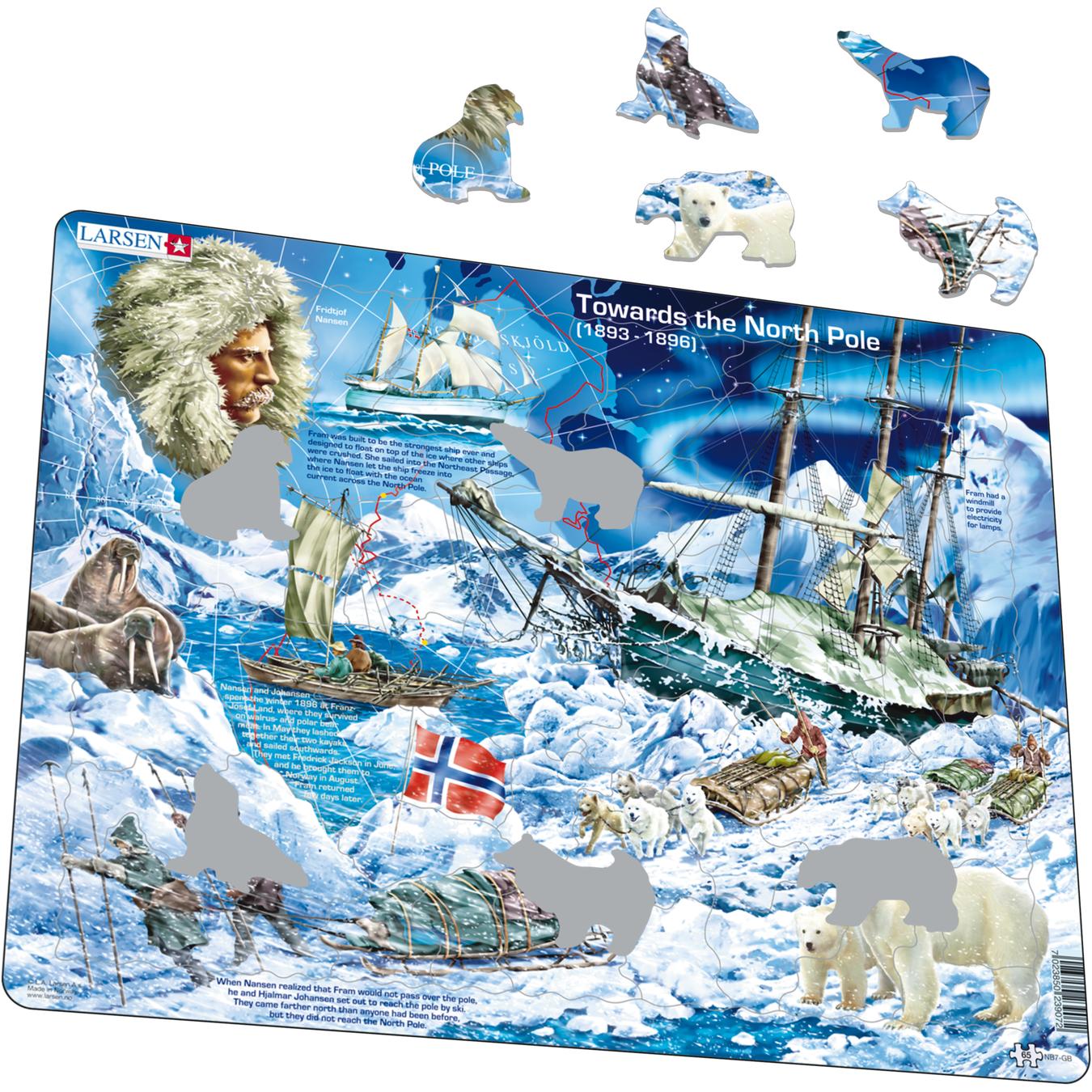 Når vi går århundrer tilbake, 1893 for å være nøyaktig, kan vi finne ut alt om Fritjof Nansen og skipet hans, kalt Fram. Du vil lære alt om Nansens oppdrag for å nå Nordpolen. Fram var et av de sterkeste skipene som noen gang er bygget, og det var designet for å flyte på toppen av isen. Da Fritjof innså at skipet hans ikke ville passere Nordpolen, dro han ut for å nå det på ski. I 1896 tilbrakte Nansen og Johansen hele vinteren der de overlevde på hvalross- og isbjørnkjøtt. Dette puslespillet leveres komplett med 65 spesialkuttede brikker, hvorav noen er formet som en hund, en isbjørn, en hvalross og noen få andre arktiske dyr. Puslespillet forteller en flott historie og reise fra 1893-1896, med informasjon om reisen deres gjennom hele reisen. Det passer best for litt eldre barn.