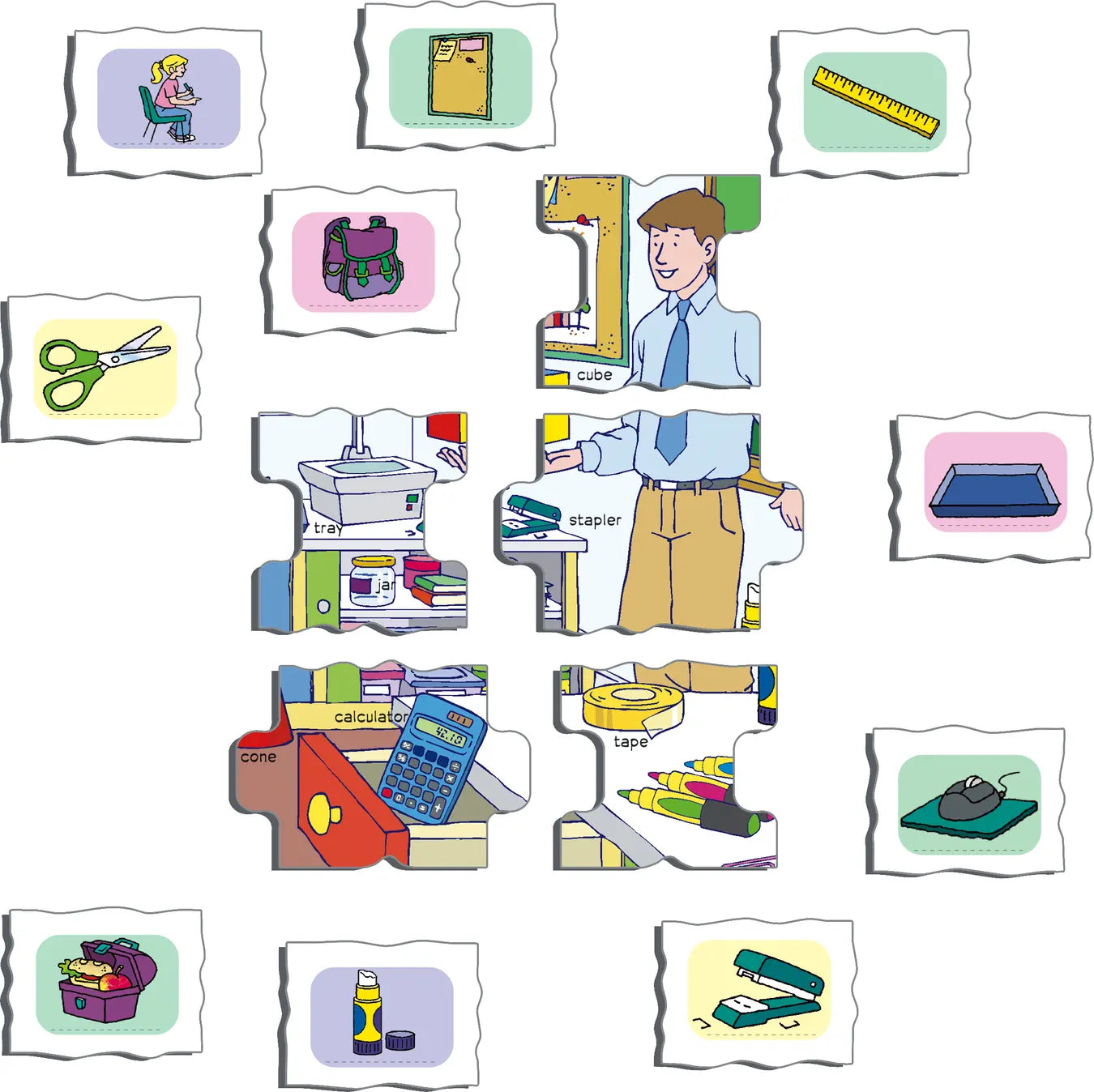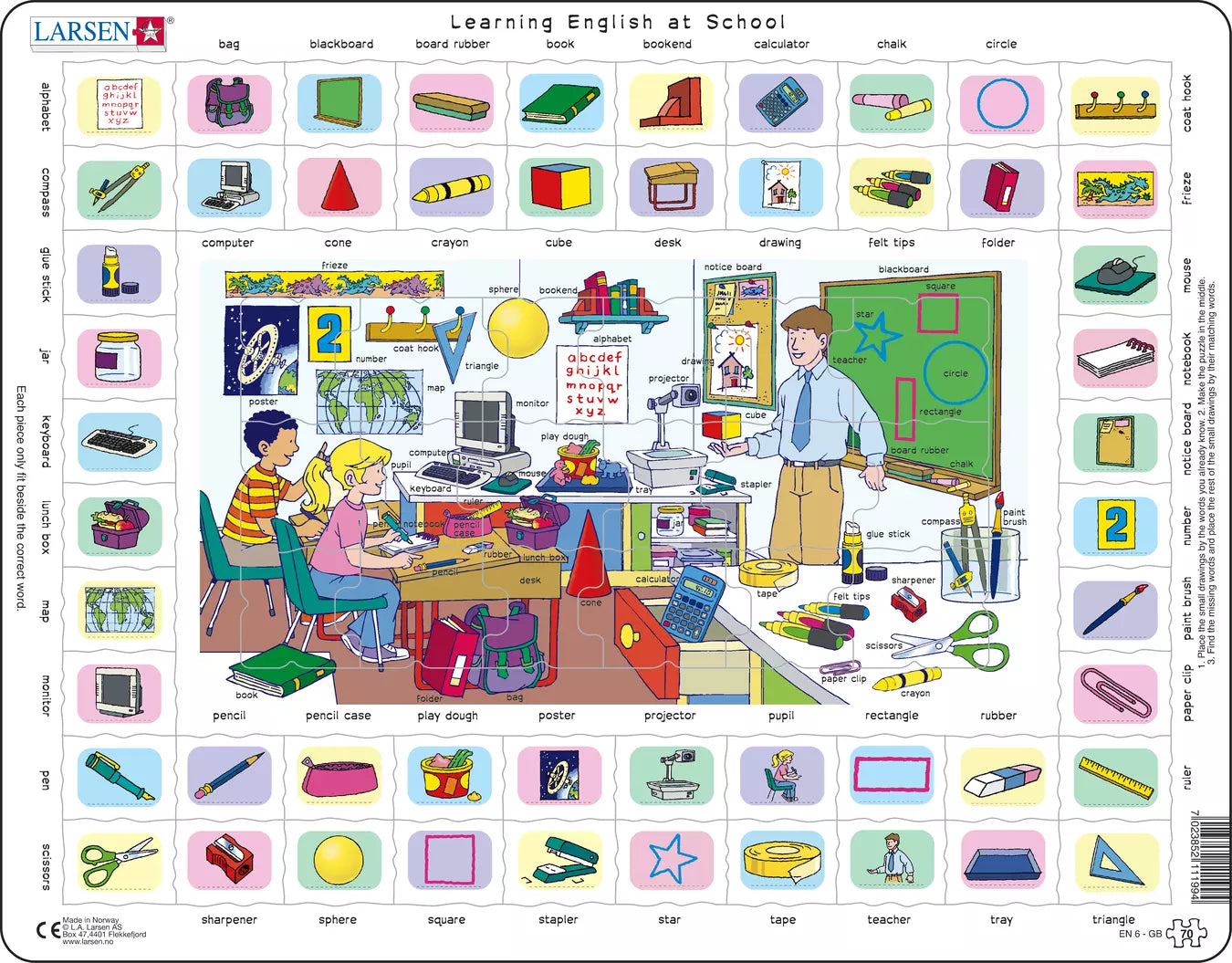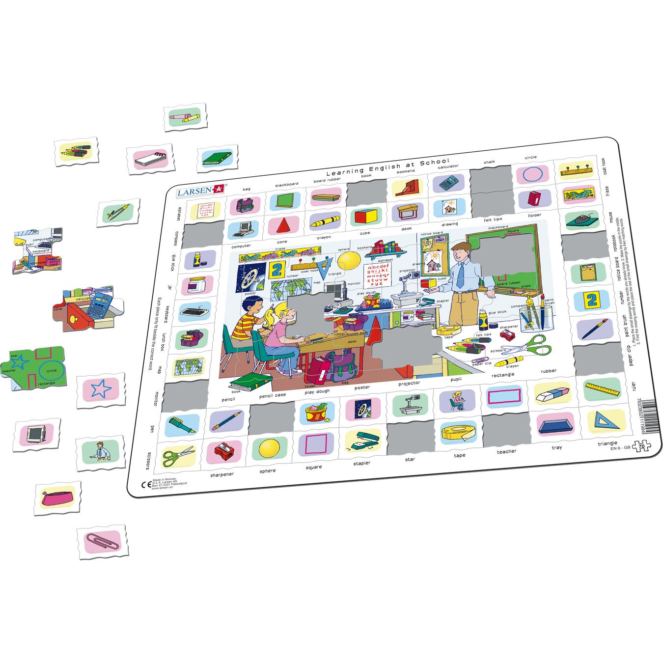 Lær 52 ord på engelsk med dette pedagogiske puslespillet. I midten er det et lite puslespill med 18 brikker og en fast ramme rundt brikkene. På puslespillet er det en tegning fra en skole, og det er 52 ord på engelsk for ting du ser på tegningen. De samme 52 ordene er på rammen utenfor, og det er 52 brikker med et bilde av hver av tingene. Hver av brikkene med en ting skal plasseres ved siden av ordet for tingen. Først plasserer du brikkene med ting ved siden av ordene du kan. Fullfør deretter puslespillet i midten, og her kan du finne de engelske ordene du ikke har lært ennå. Deretter kan du enkelt legge resten av brikkene på plass. Etter noen ganger vil du huske de nye ordene du har lært.