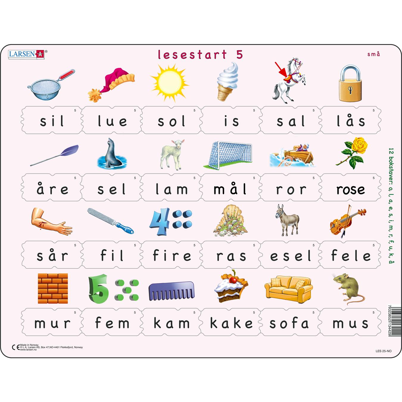 LESESTART 25 har 24 puslespillbrikker med ett ord på hver brikke. Hver brikke med et ord passer kun under bildet som matcher. Vi har inkludert 12 av de samme bokstavene som i LESESTART 23: o, l, a, e, s, i, m, r, f, u, k, å.