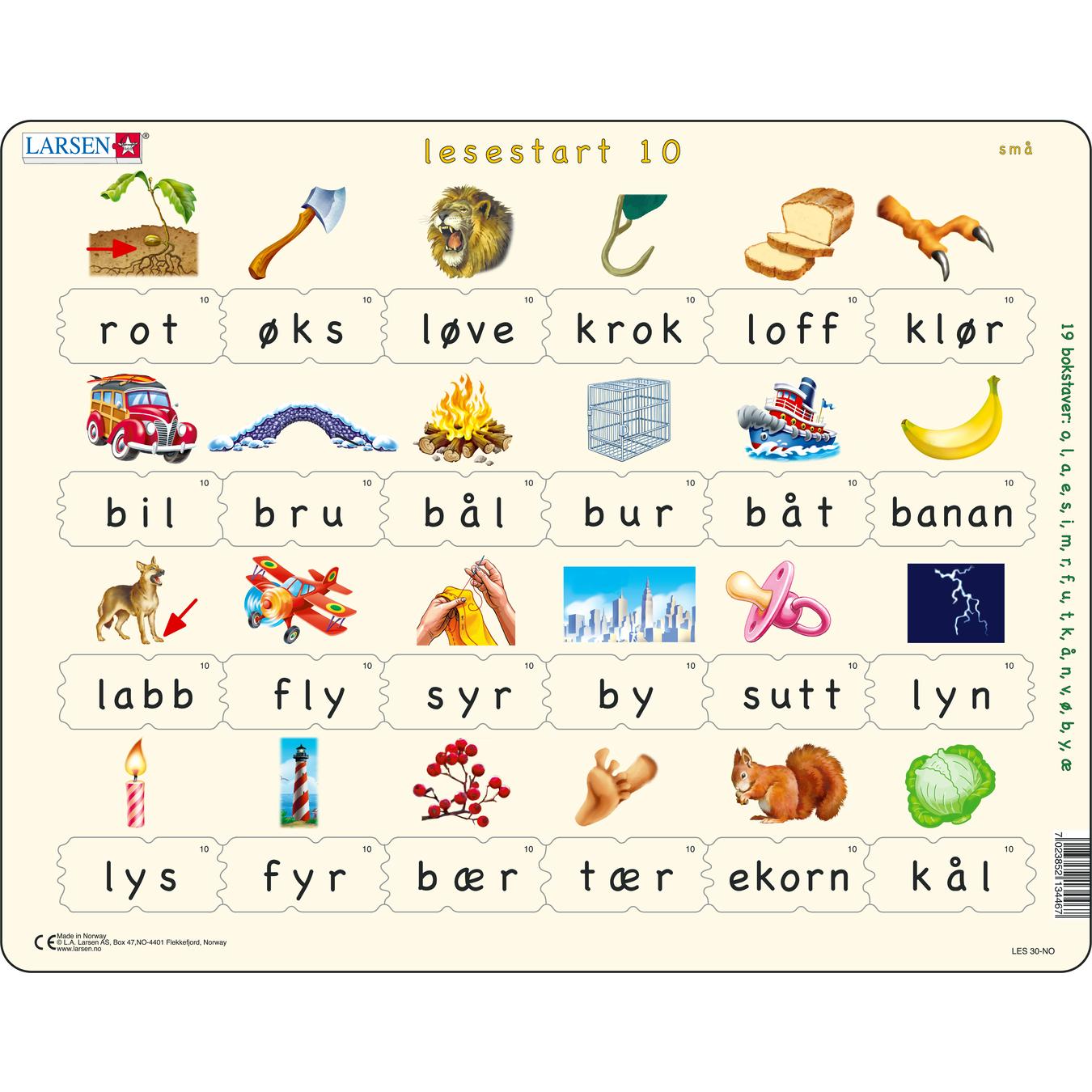 LESESTART 30 har 24 puslespillbrikker med ett ord på hver brikke. Hver brikke med et ord passer kun under bildet som passer. Vi bruker 19 bokstaver: o, l, a, e, s, i, m, r, f, u, t, k, å, n, v, ø, b, y, æ.