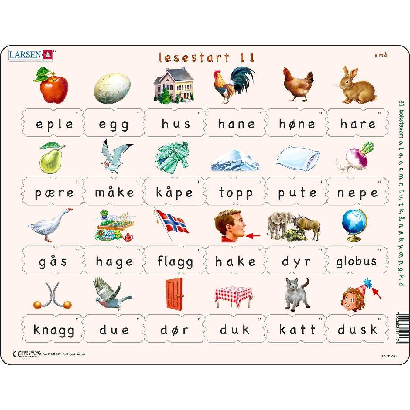 LESESTART 31 har 24 puslespillbrikker med ett ord på hver brikke. Hver brikke med et ord passer kun under bildet som matcher. Vi bruker 21 bokstaver: o, l, a, e, s, m, r, f, u, t, k, å, n, ø, b, y, æ, p, g, h, d.