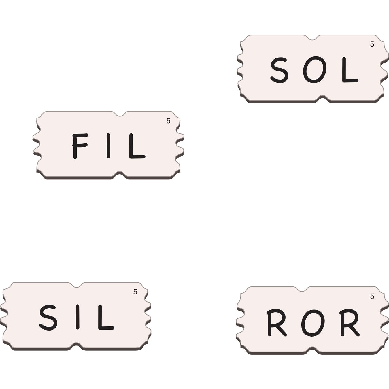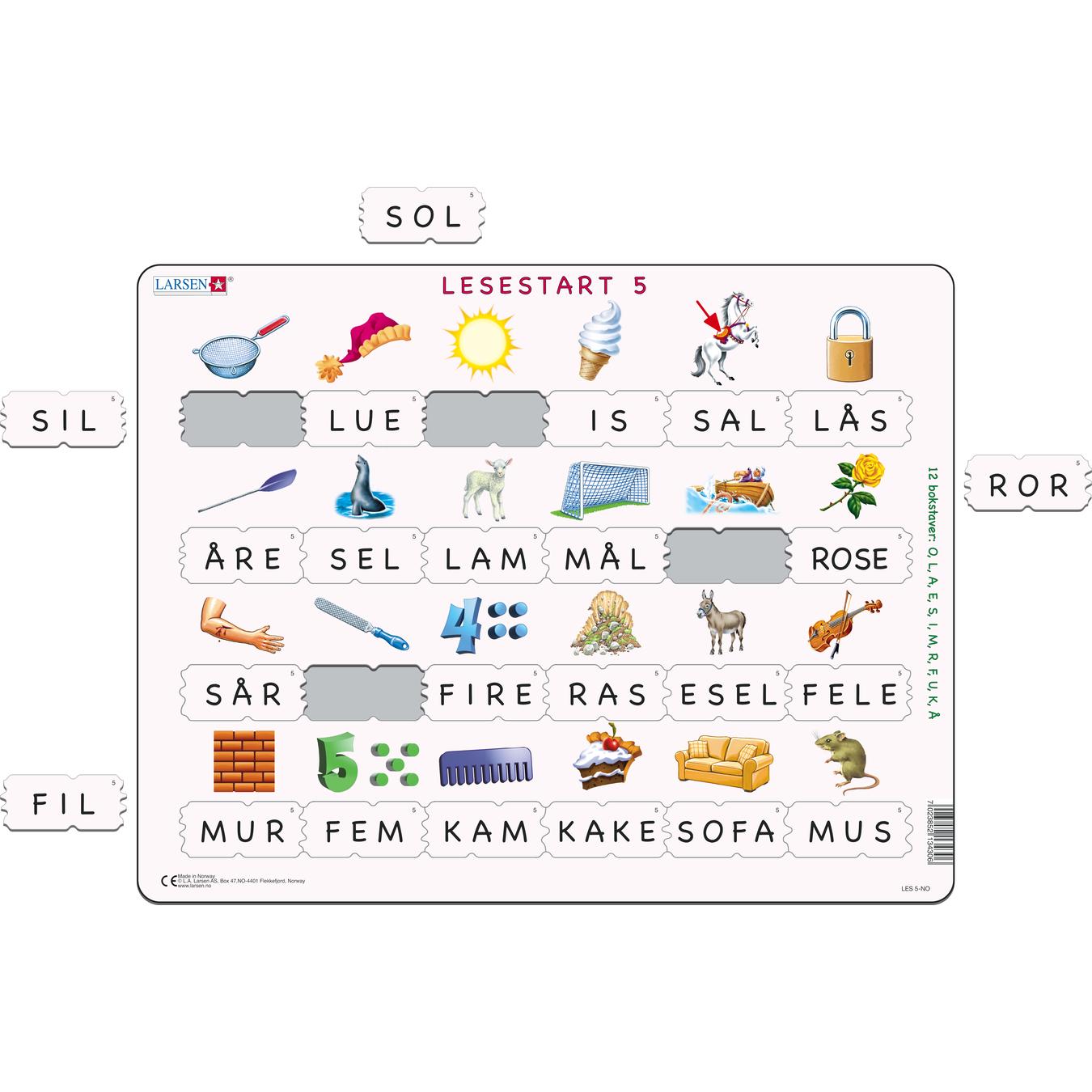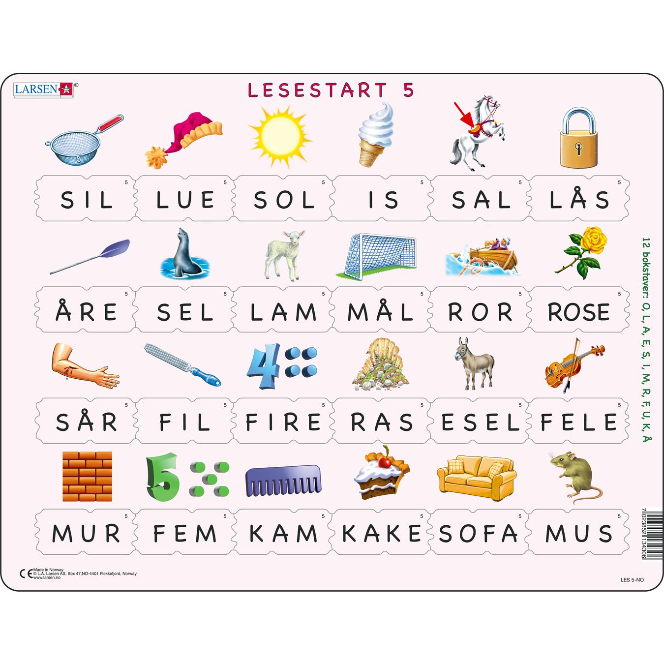 LESESTART 5 har 24 puslespillbrikker med ett ord på hver brikke. Hver brikke med et ord passer kun under bildet som matcher. Vi har inkludert 12 av de samme bokstavene som i LESING START 3: O, L, A, E, S, I, M, R, F, U, K, Å.