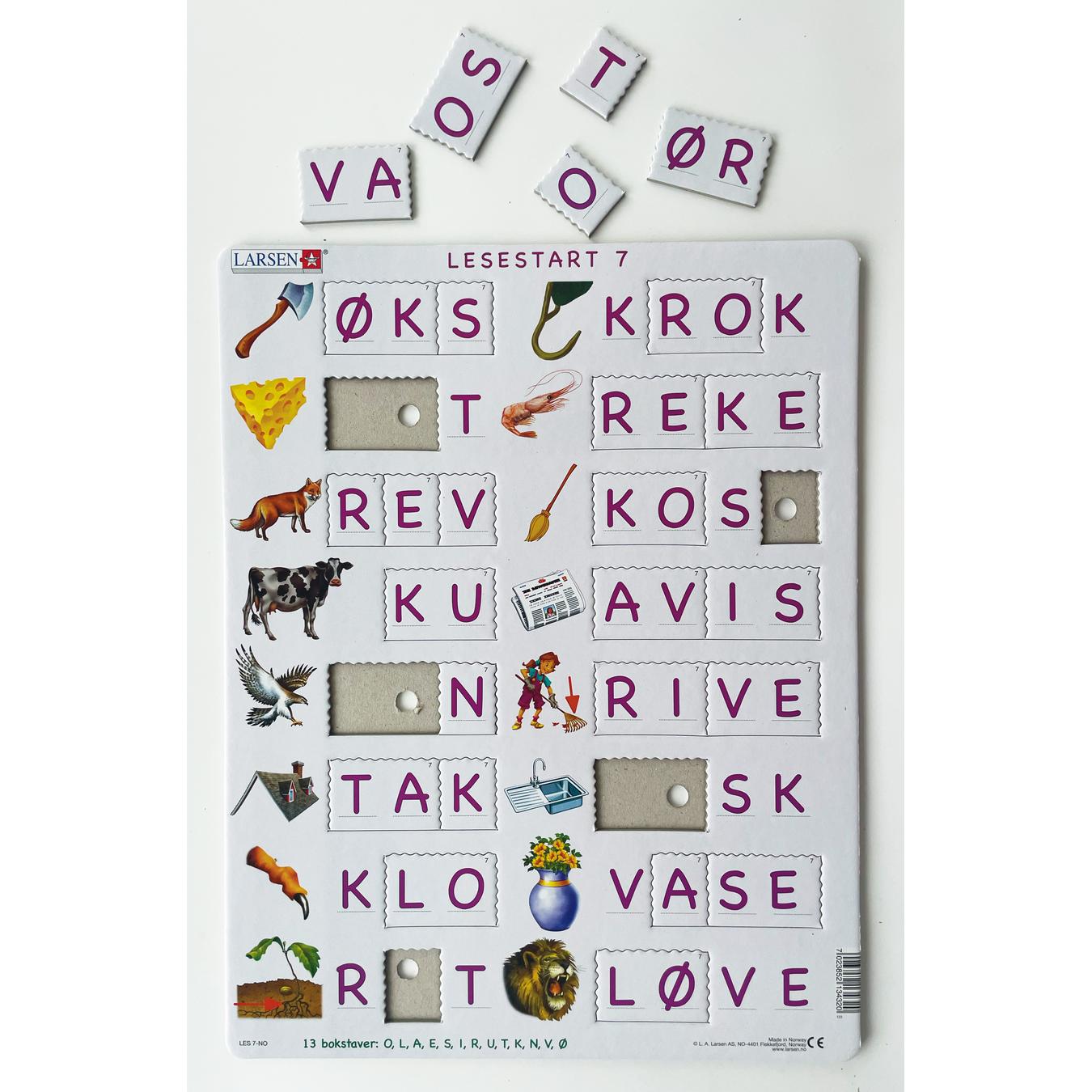 LESESTART 7 har 23 brikker med en bokstav eller en stavelse på hver brikke. Bokstavene er: O, L, A, E, S, I, R, U, T, K, N, V, Ø. Sett brikkene sammen til ord som matcher de 16 tegningene på rammen. Ikke alle bokstavene står på brikkene, noen står fast på rammen og er til hjelp for den som pusler.