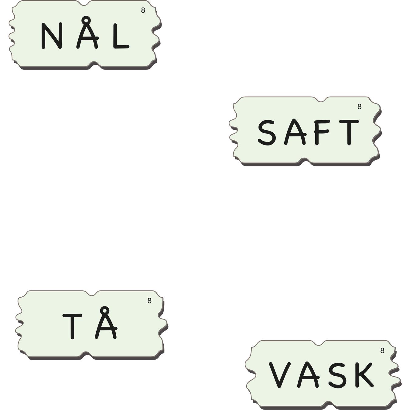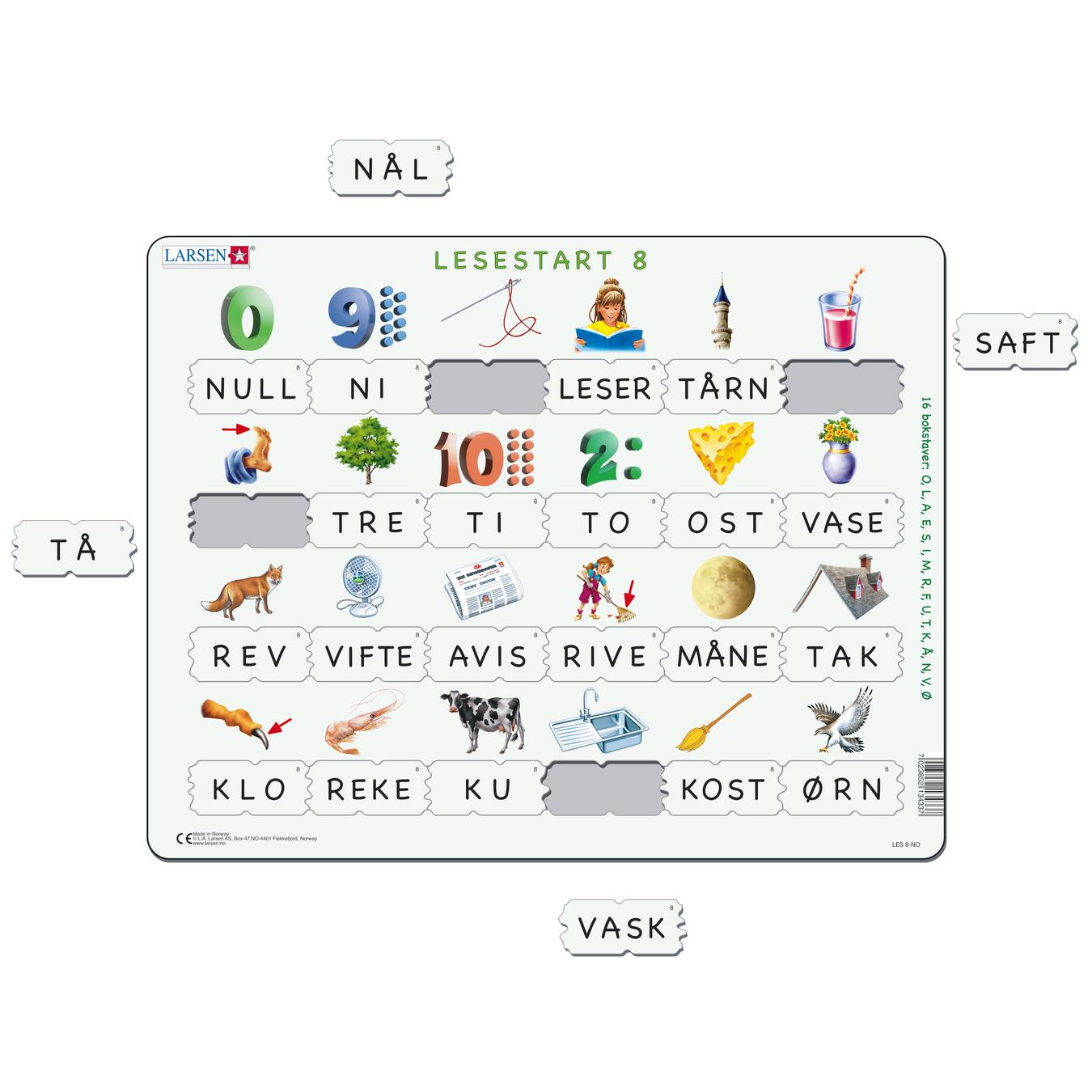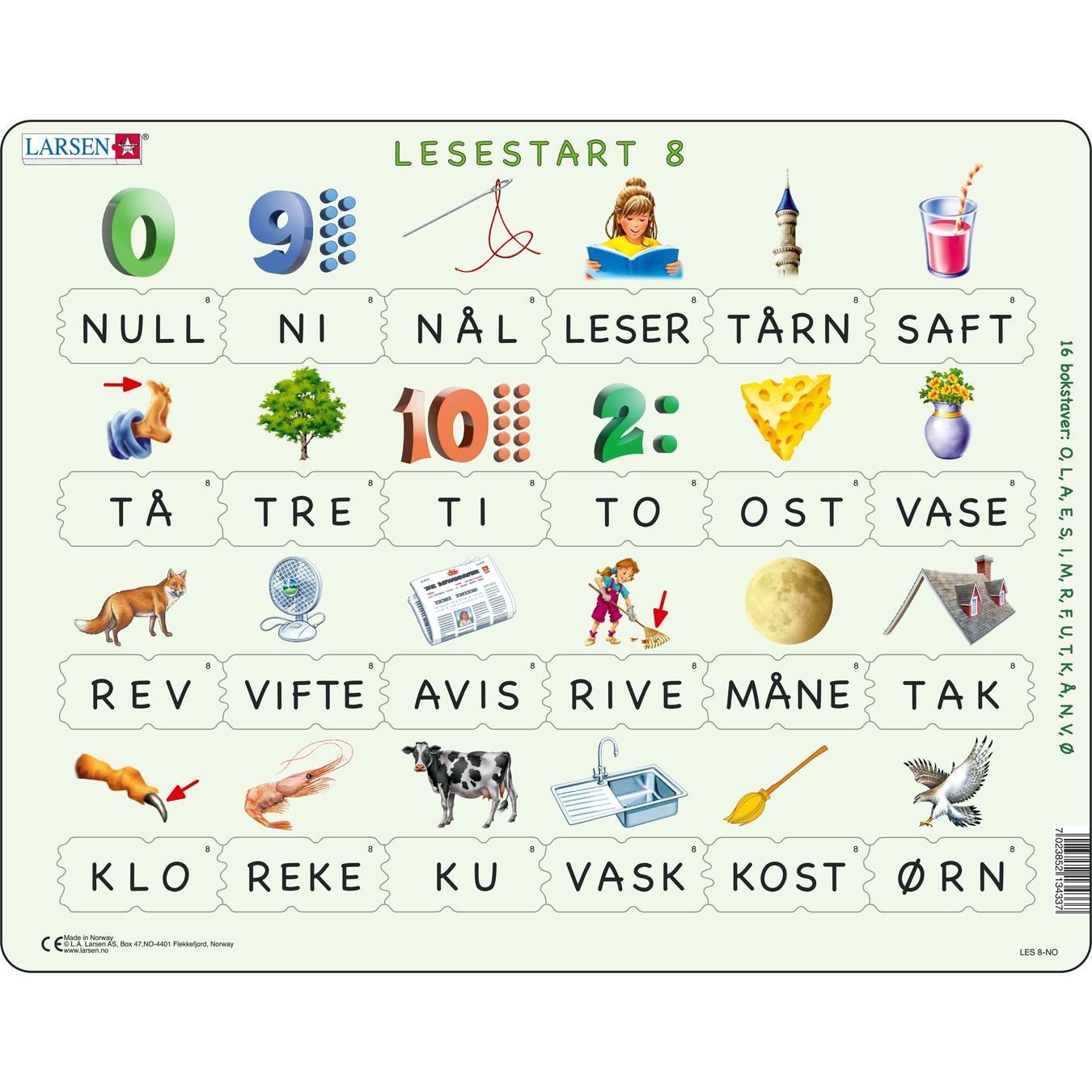 LESESTART 8 har 24 puslespillbrikker med ett ord på hver brikke. Hver brikke med et ord passer kun under bildet som passer. Vi bruker 16 bokstaver: O, L, A, E, S, I, M, R, F, U, T, K, Å, N, V, Ø.