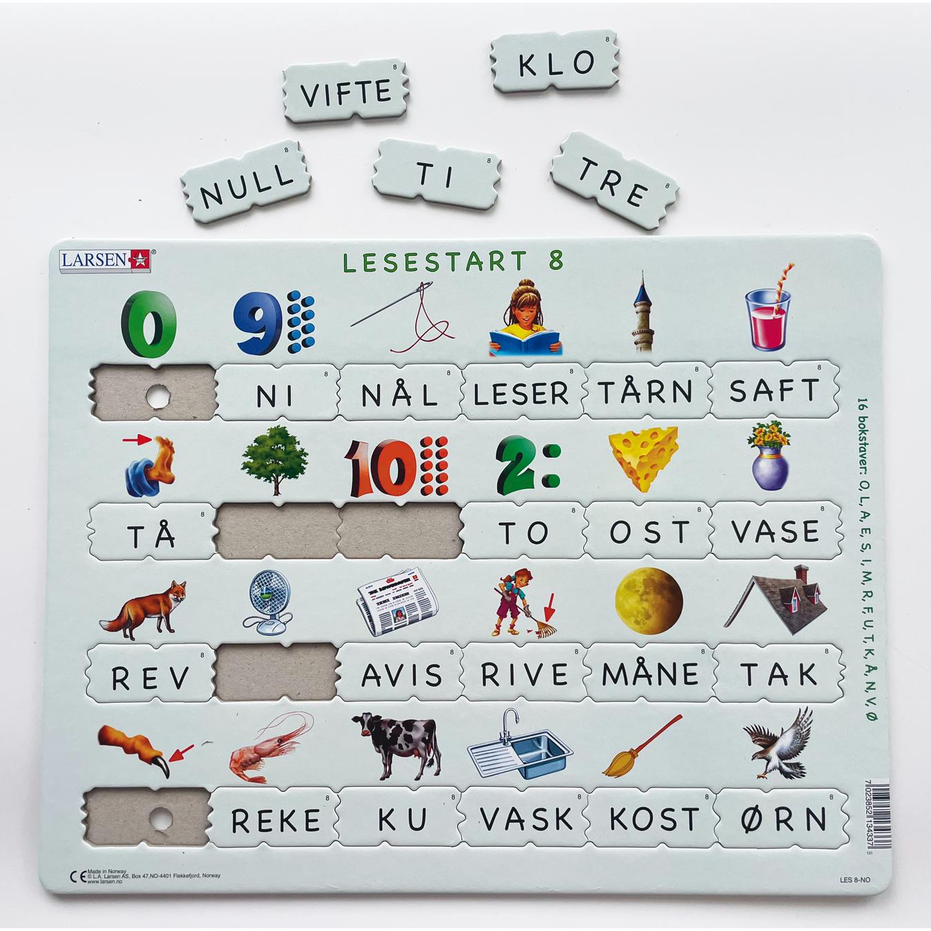 LESESTART 8 har 24 brikker med 1 ord på hver brikke. Hver brikke med ord passer kun under bildet som matcher. Vi har med  16 bokstaver: O, L, A, E, S, I, M, R, F, U, T, K, Å, N, V, Ø.