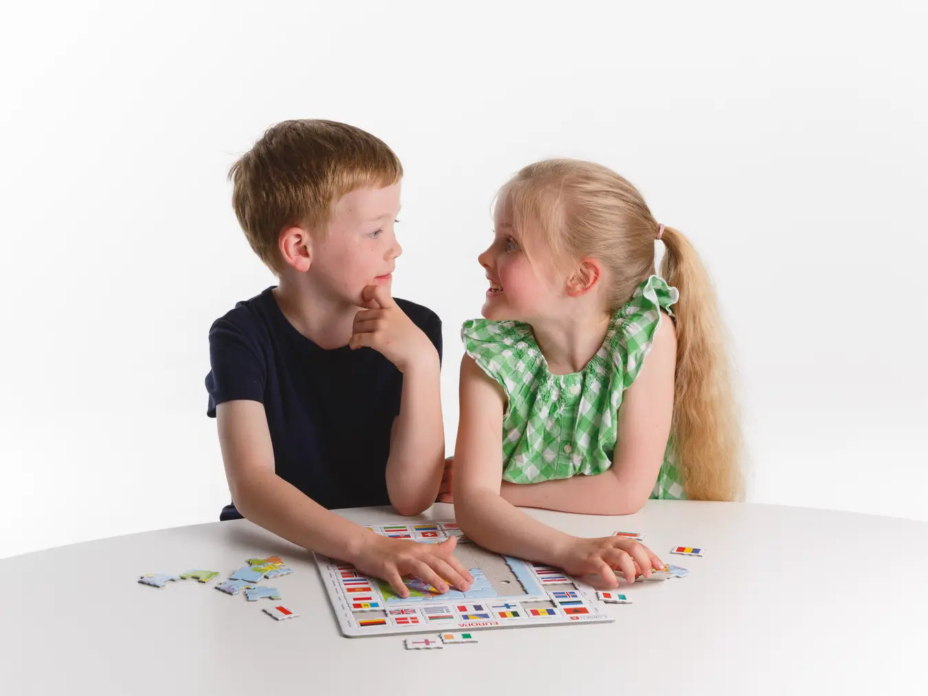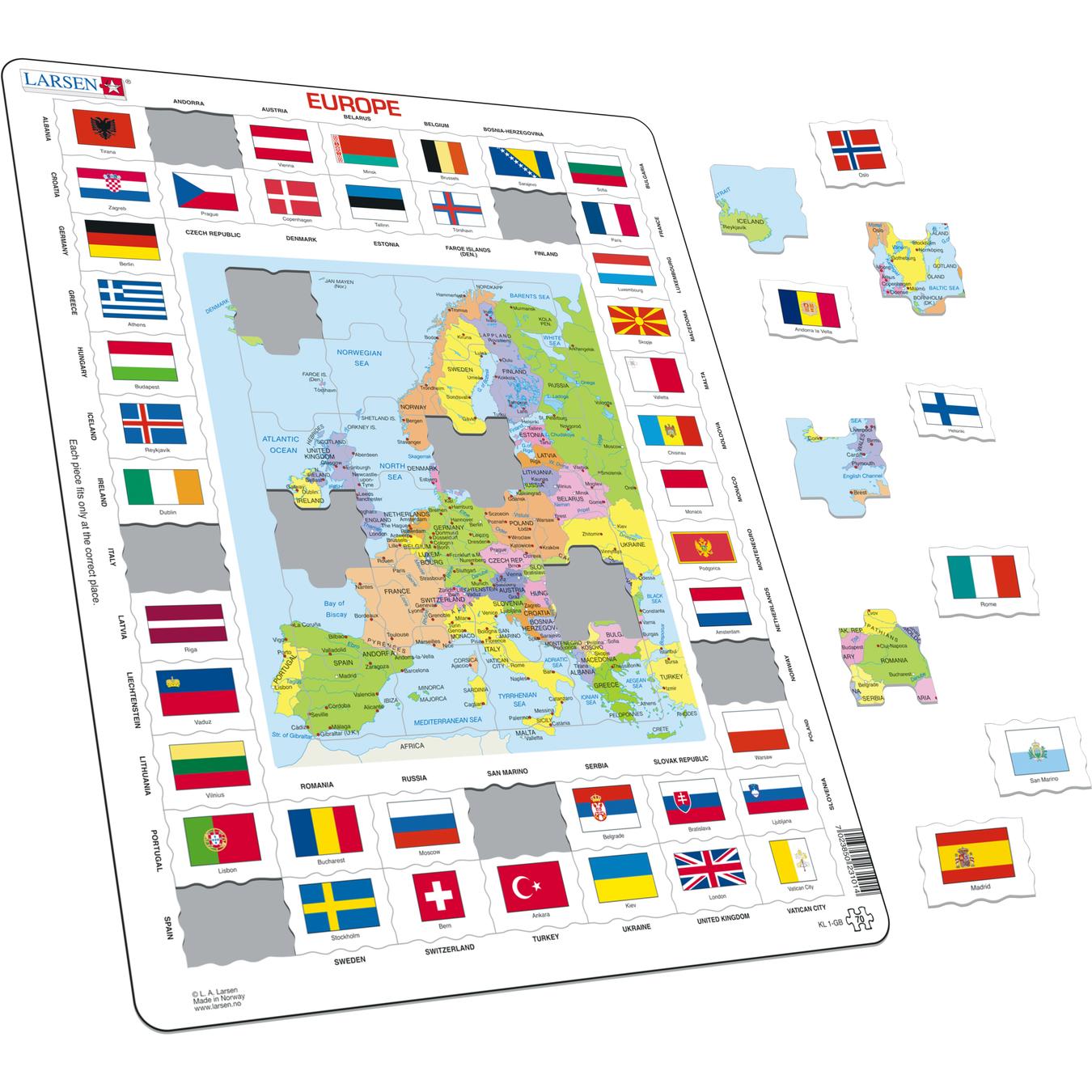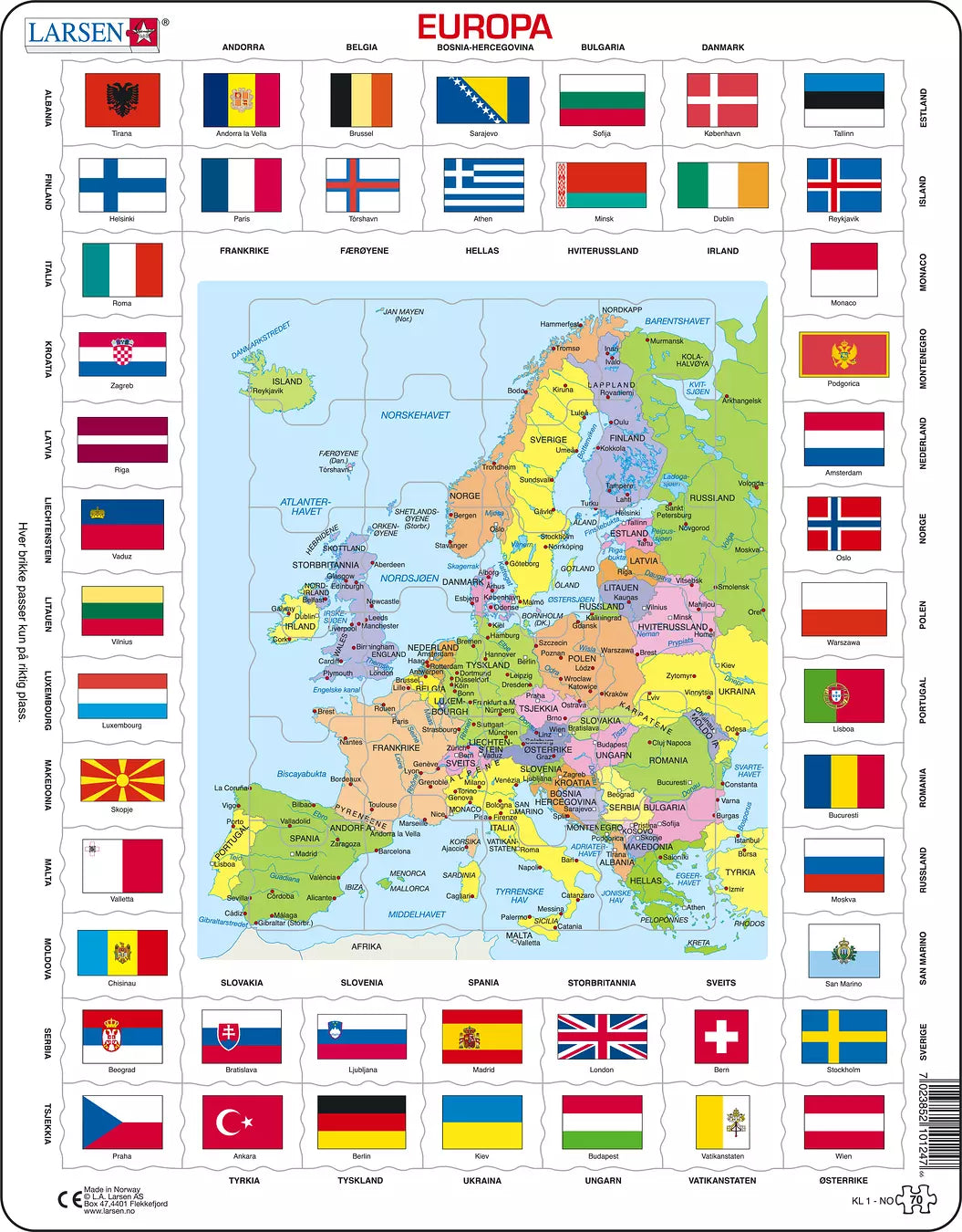 Lær navnene på 46 land og hovedsteder, og se hvor de ligger. Dette fantastiske kart- og flaggpuslespillet har 46 brikker med flagget til et land og landets hovedstad rundt rammen. Navnet på hvert av landene er trykt på rammen, og hver puslespillbrikke med et flagg passer bare ved siden av det matchende landsnavnet.
