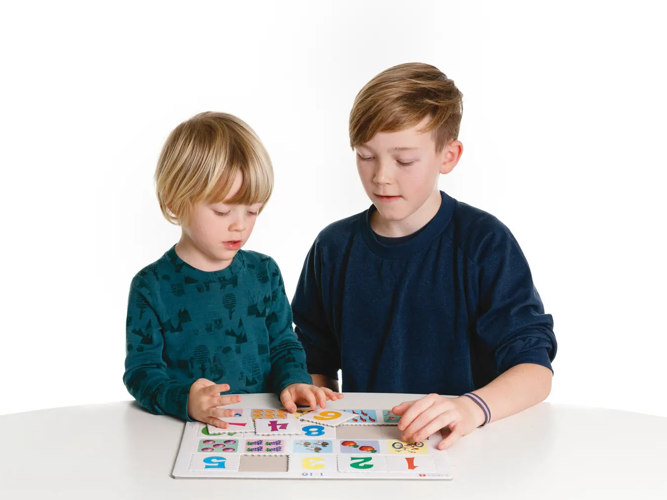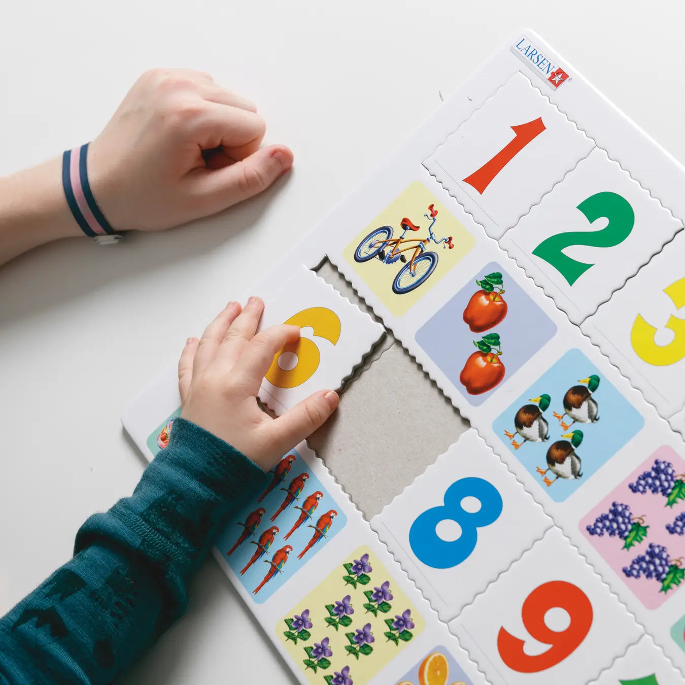 «En gul sykkel, to røde epler, tre kranglende ender, klare til å takle. Fire saftige druer og fem sprettende baller som går opp og ned og treffer gulvet. Seks kremete yoghurter, 7 pratsomme papegøyer, 8 lilla blomster, men ingen oransje gulrøtter! Det er imidlertid 9 oransje frukter, 10 globuser over hele verden, akkurat nok til meg og deg!» Dette grunnleggende tallpuslespillet oppmuntrer til og fremmer tallgjenkjenning. Hver puslespillbrikke er nøye vist med et tall. Illustrasjonen som representerer tallet vises på tvers av rammen, rett under den øverste raden. Tallene er i lyse, iøynefallende farger, med en buet kant. Dette puslespillet leveres komplett med 10 brikker med buede kanter som er best egnet for yngre barn som lærer tallene sine fra 1-10.