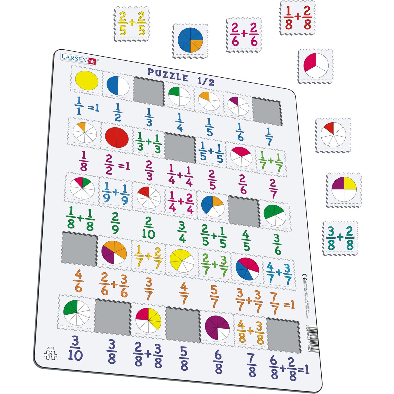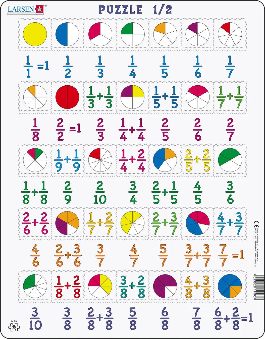 Bli med på all moroa mens du lærer brøker med dette fargerike og illustrerende puslespillet med 35 brikker. Du finner 10 rader med brøker, en blanding av både illustrasjoner og numeriske brøker. Selve puslespillbrikkene består også av både illustrasjoner og aritmetiske brøker. Rammen er preget av brøker relatert til riktig illustrasjon plassert ovenfor. Lyse og sterke farger brukes gjennomgående for å fange puslespillerens oppmerksomhet. Dette puslespillet leveres komplett med 35 brikker med buede kanter og passer best for litt yngre barn som lærer grunnleggende brøker.