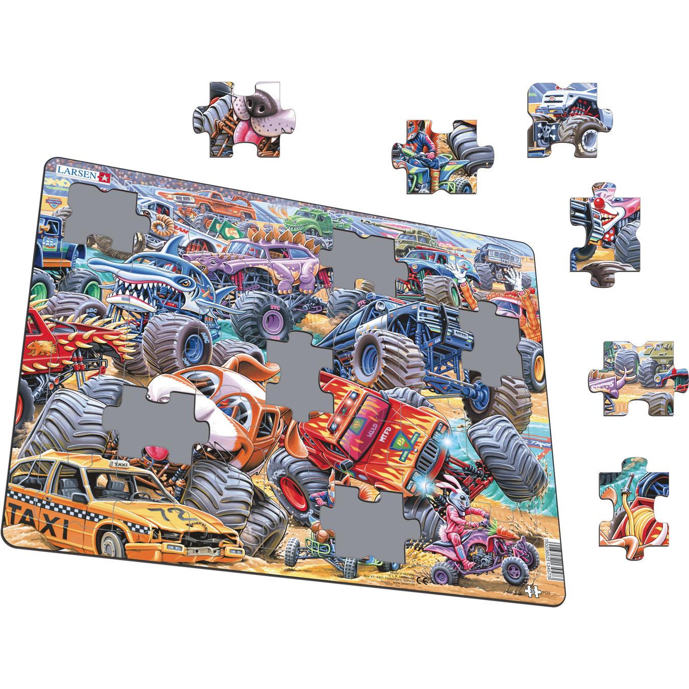 Det er kaotisk på racerbanen. Bilene kjører på en grusbane med ramper og andre hindringer. Et par firehjulinger med førere forkledd som ekorn og kanin har kommet seg ut på banen, og et vrak av en taxi står også i veien for bilene som kappes om å komme først i mål. Bilene er lakkert og utstyrt som en skorpion, drage, tanks, FBI, pirat, vær, stegosaurus, surfer, klovn, hai, politi, piggsvin, valp og brannbil. Det fargerike puslespillet med 35 tradisjonelt formede puslespill-brikker vil begeistre og stimulere alle med fascinasjon for kraftfulle biler.