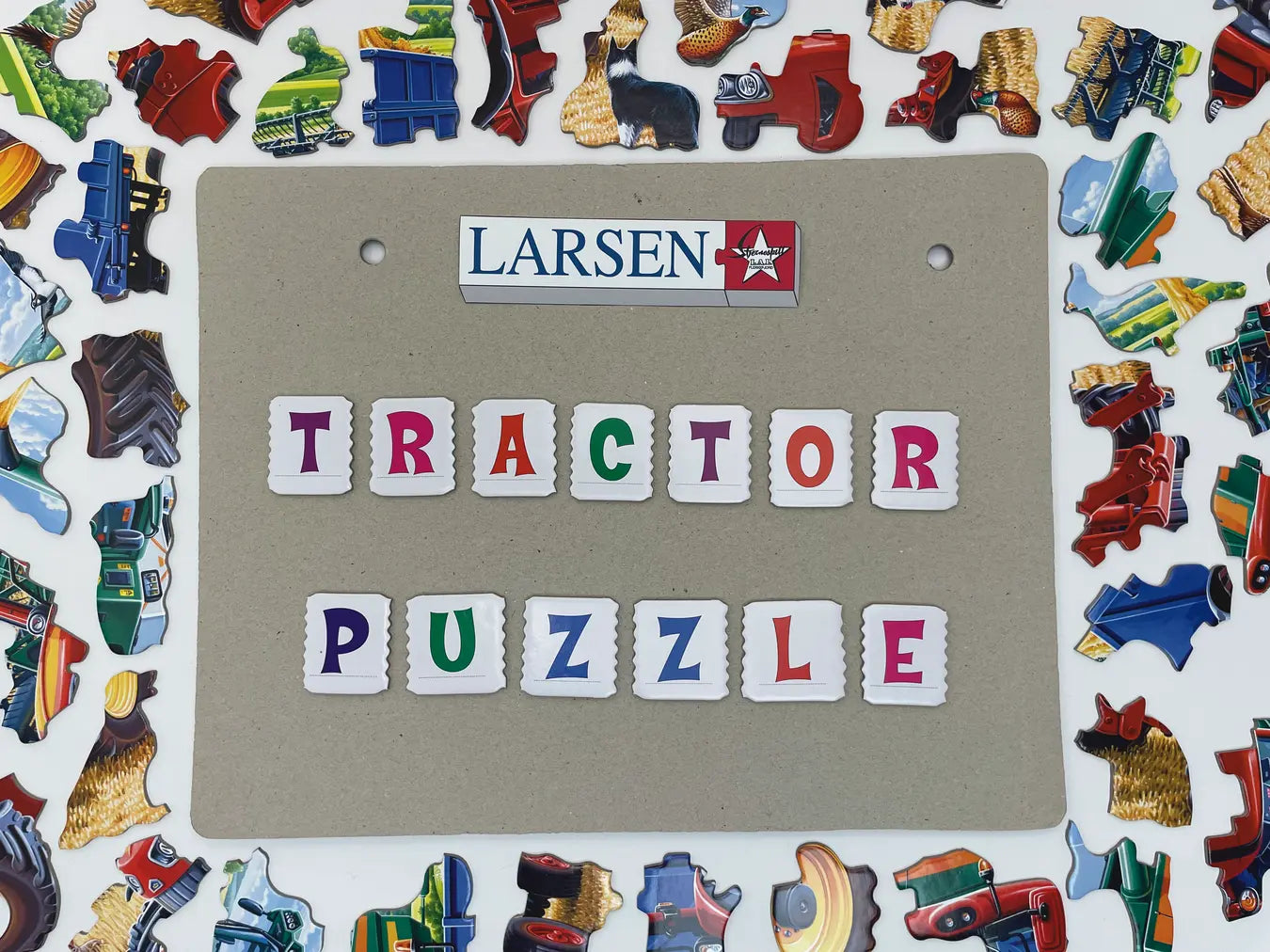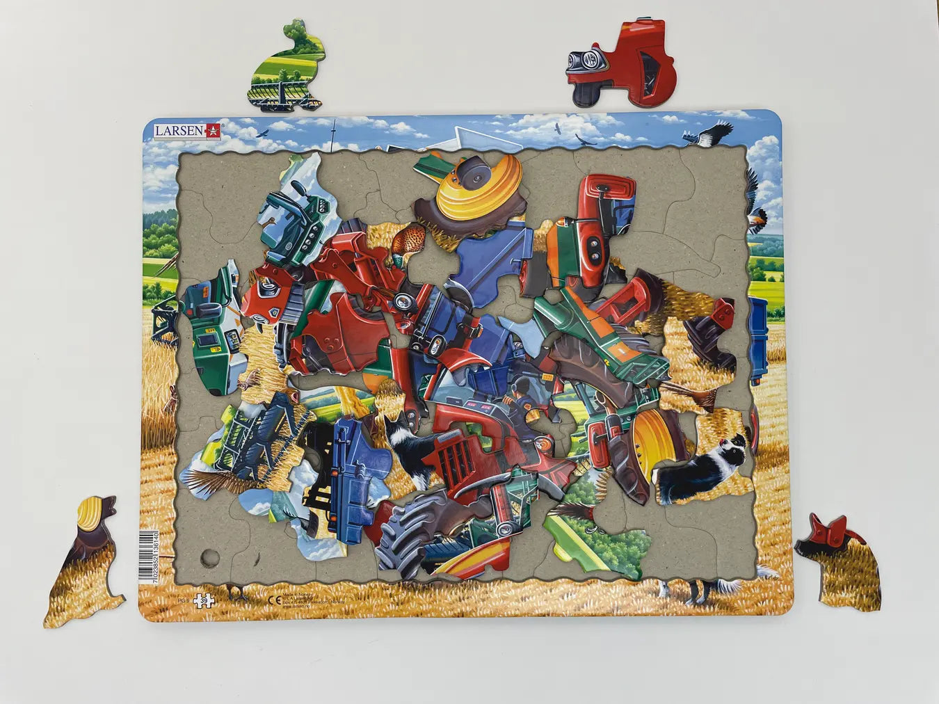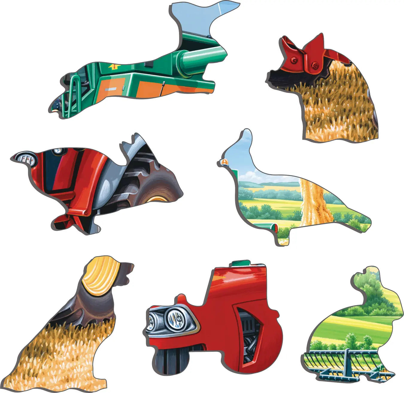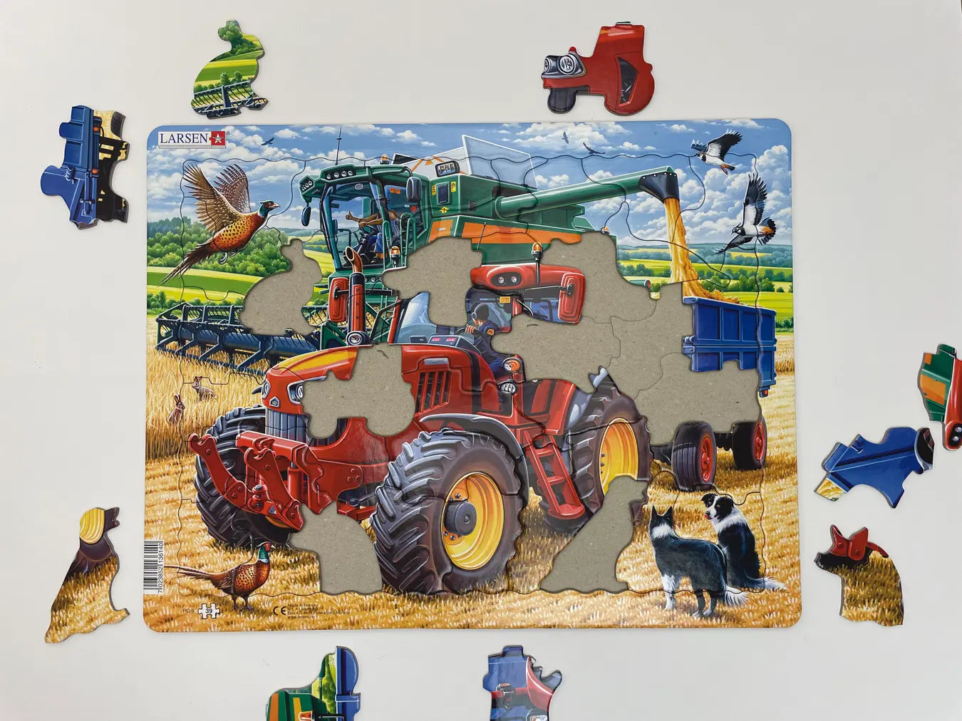 Den grønne skurtreskeren har samlet inn korn fra kornåkeren. Inne i skurtreskeren blir kornet slått og ristet. Deretter føres kornet inn i en tank mens halmen blåses ut bak. Treskeren står stille mens kornet overføres til en tilhenger som skal ta det inn til gården for å tørkes. To kaniner foran skurtreskeren må løpe før maskinen begynner å gå igjen. En fasan foran traktoren må opp på vingene igjen før traktoren starter. Noen av de 39 puslespillbrikkene er formet som kaniner, hunder, traktor og fasan. Dette er et puslespill for alle som elsker traktorer og store maskiner.