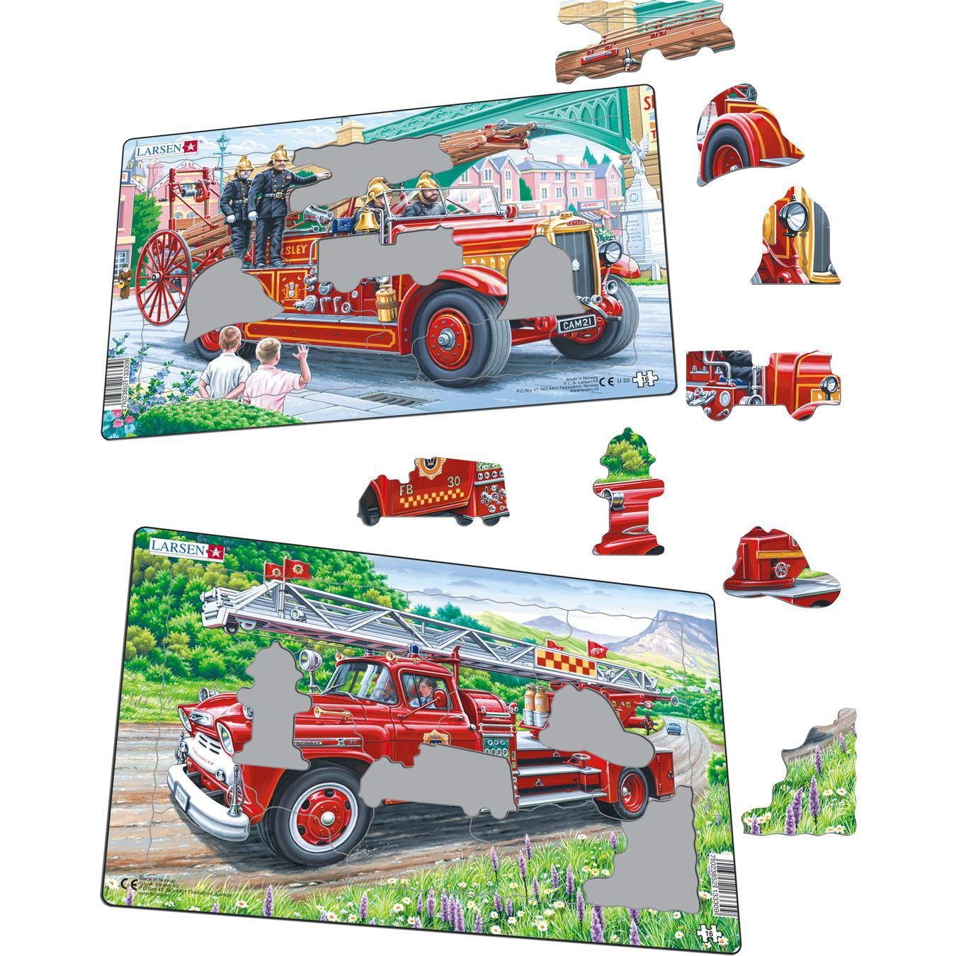 Det er aldri hyggelig når noe brenner. Likevel er det gøy å se på brannbiler, og brannbiler av god gammel årgang er ekstra fine og morsomme å se på. Her er to puslespill med brannbiler med stige i full fart for å slukke en brann, det er nesten som om du kan høre sirenene ule. Hvert av puslespillene har 16 brikker, og noen av brikkene har form som hjelm, klokke, brannbil og brannhydrant.