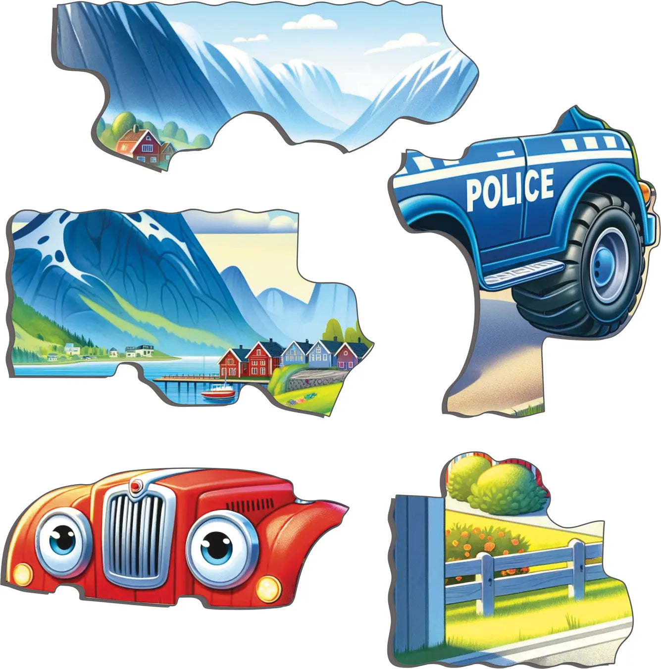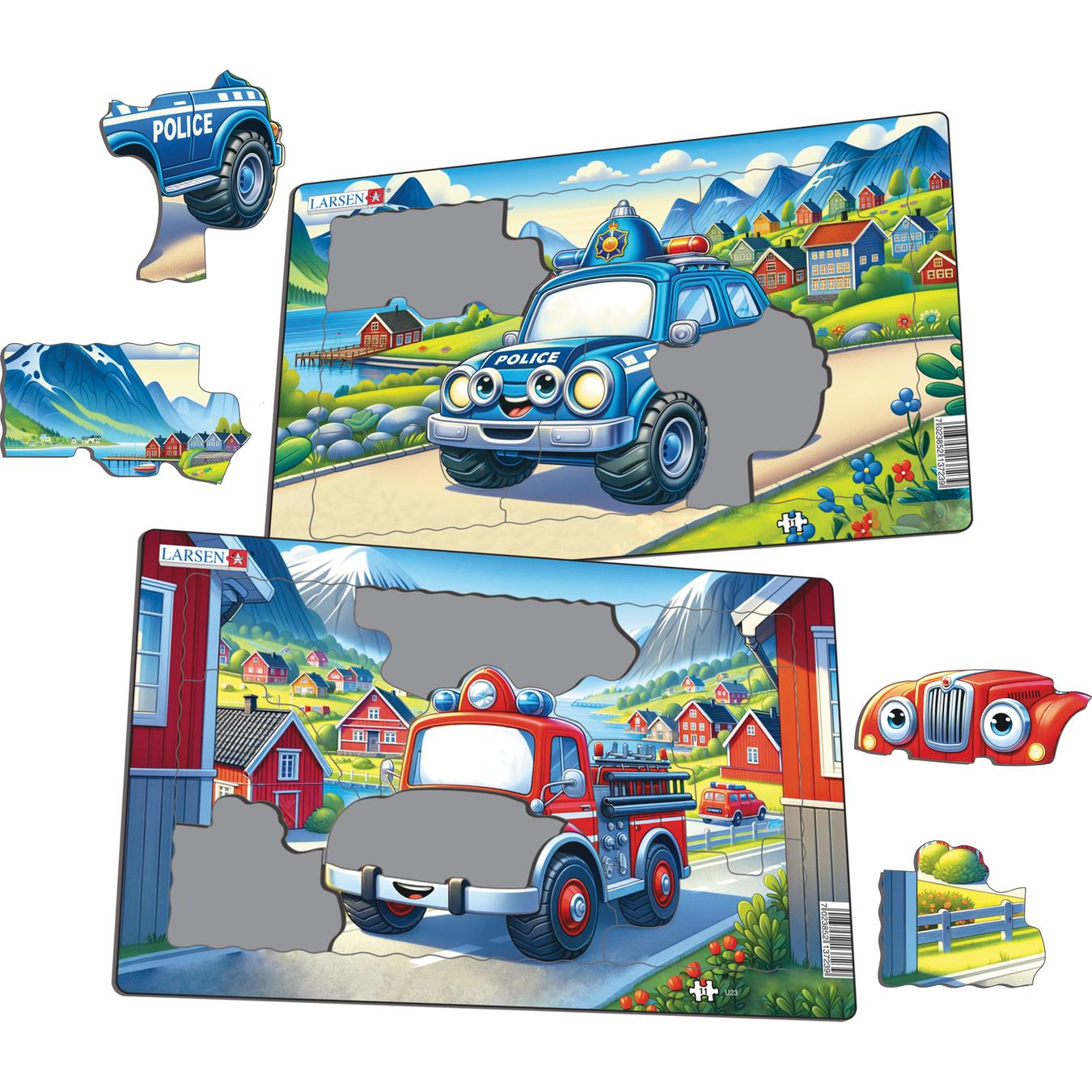 Det ene av disse to puslespillene har et bilde av en brannbil, og det andre en politibil. I bakgrunnen er fargerike små hus, en fjord og høye fjell med snø på toppene. Hvert puslespill har 11 brikker, og noen av puslespillbrikkene er stanset ut langs konturene av bildet. Disse puslespillene passer for små barn.