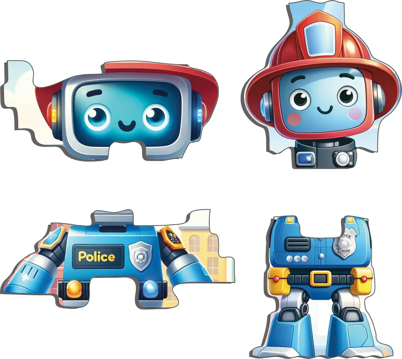 Robot Politi og Robot Brannmann patuljerer i storbyen. De går rundt og passer på at alle oppfører seg pent, og at det ikke brenner noen steder. Om noen trenger hjelp er de alltid glade for å være til nytte for alle som bor i byen. Hvert puslespill har 11 brikker, og noen av brikkene er stanset ut langds konturene i bildet. Disse puslespillene passer for små barn.