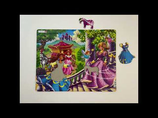 Alle jenter drømmer om å være en prinsesse. Dette puslespillet har 24 brikker som alle prinsesser kan klare. Noen av brikkene er formet som en kjole, et hjerte, en konge og en hest. En del brikker kan settes sammen til et slott. Illustrasjonen har 3 prinsesser, to feer, en hest og en hestevogn, en kongelig steintrapp, og et lilla slott på toppen av haugen. I bakgrunnen kan vi se hundrevis av kvadratmeter med nyklippet gress i slottets hage. Alle prinsessene er kledd opp i nydelige kjoler og de ser ut som om de gleder seg til å høre gode nyheter. Hest og vogn står klare til å kjøre prinsessene, hva tror du det er for noen gode nyheter de venter på?