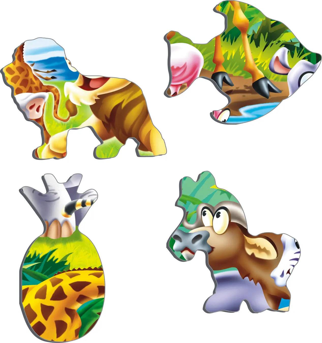 Savannen er rett forut i dette stilige dyreliv puslespillet. Safari puslespillet passer best til små hender, da det har 18 store brikker. Du kan se en elefant, to giraffer, en løve, en pelikan, en fugl, to geparder, en flodhest, en sebra, en brun okse, en hjort, og en rosa flamingo. Mens flodhesten svømmer en tur i det kjølige vannet nyter dyrene på land den varme solen. Dette tegneserieaktige puslespillet passer til barn som liker dyr. Noen av brikkene er formet som f en fisk, en ananas, en pære, en fugl og en løve. Kan du gjette hva andre av brikkene er formet som?