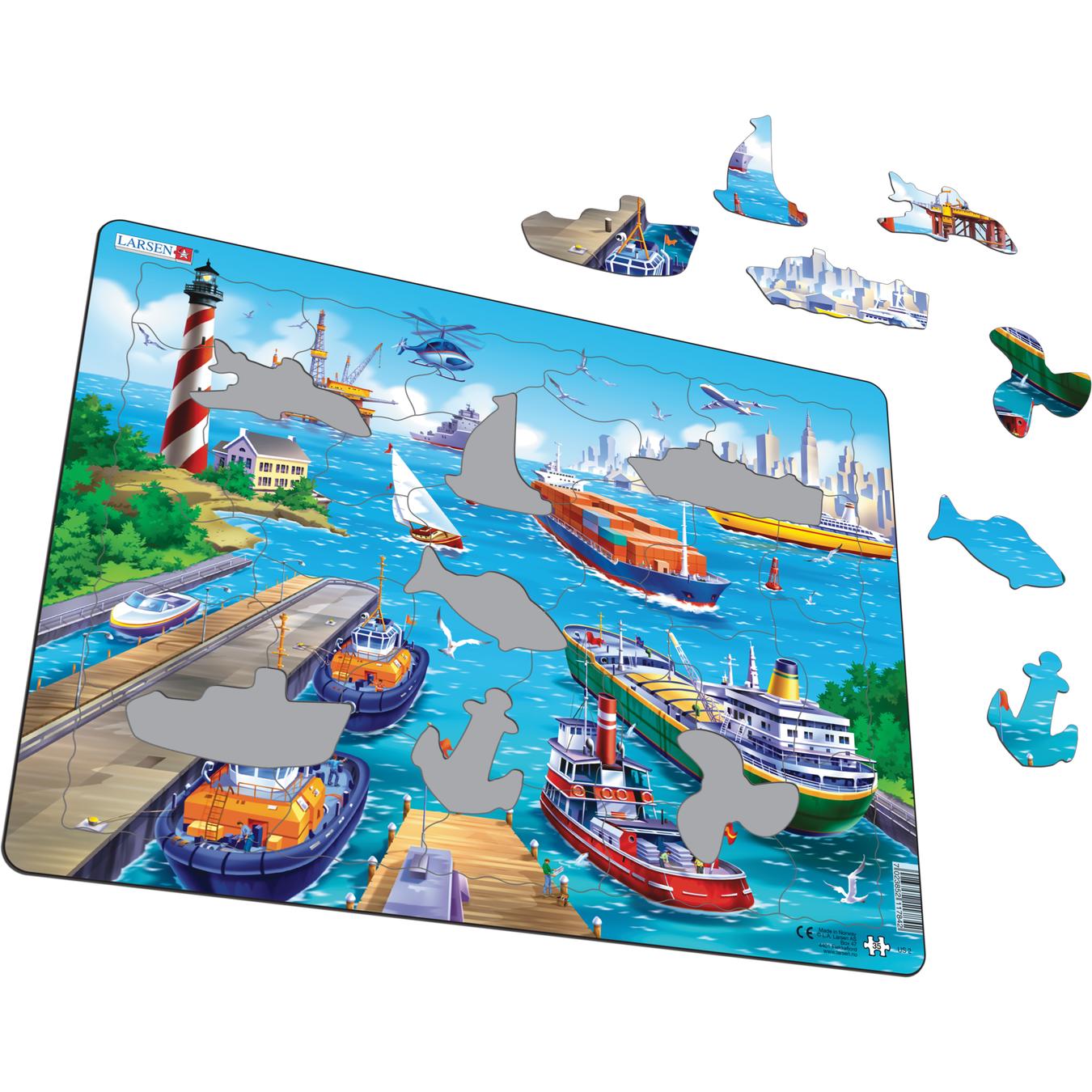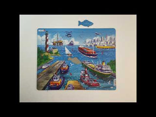En stor havn er et av de travlest steder i verden. Det er alltid mange skip som kommer og går. To store taubåter ligger ved siden av en speedbåt. Et stort lasteskip har blitt fylt opp med containere og holder på å bli fraktet ut av havnen. Hva tror du er i containerne? Et cruise ship er på vei ut på havet, du kan også se en oljerigg. Er det et et krigsskip ute i horisonten?