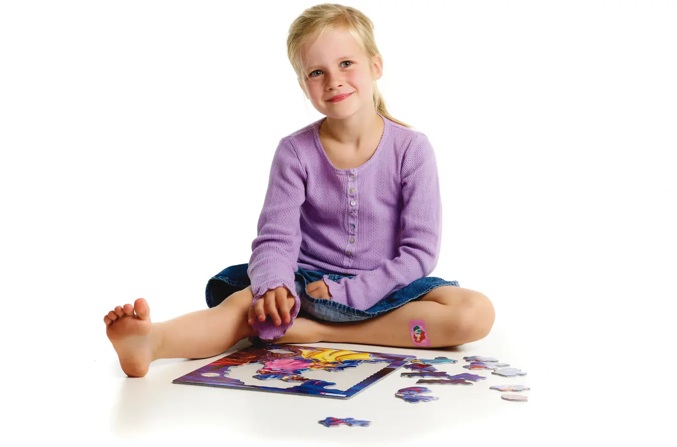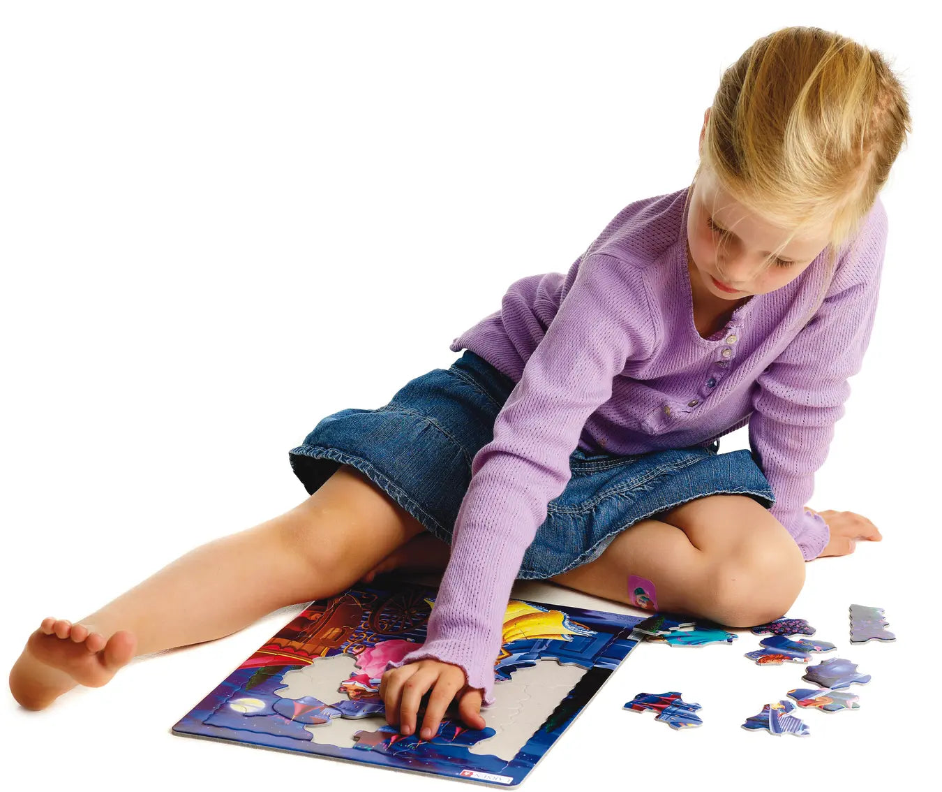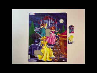 Det er magi ved midnatt på denne stjerneklare natten med denne henrivende skildringen av et prinsessepuslespill. Tre vakre prinsesser går ned trappene fra det luksuriøse eventyrslottet etter en fantastisk kveld på ballet. Mens vognen venter på dem, blinker stjernene på himmelen, og månen skinner sterkere enn solen klokken 06.00. Dette puslespillet med 35 brikker har nøye utskårne brikker formet som et par lepper, en eikenøtt, en varebil, et nøkkelhull og en sopp. Hver prinsesse er kledd i en forskjellig farget kjole for å skille seg ut om natten. Kan du gjette hvilken som er den neste i køen til å regjere? Dette puslespillet har større brikker og passer best for yngre barn, gamle nok til å identifisere grunnleggende former.