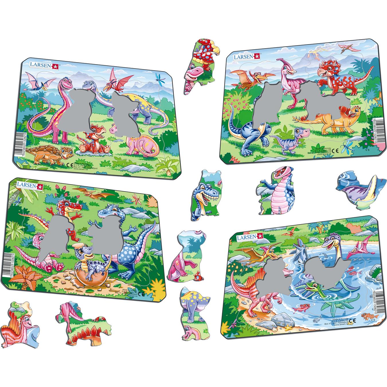 Her er 4 MINI-puslespill med 7 brikker og lekne dinosaurer laget for de aller minste. To av brikkene i hvert puslespill er laget som figurer av forskjellige dyr. Alle vil like disse muntre og vennlige dinosaurene, som er laget for å spre glede og stimulere fantasien. Her er flygende øgler, svømmende dinosaurer, langhalsede sauropoder, triceratops med horn og dinosaurer med seil på ryggen. En liten dinosaurunge er på vei ut av egget. Kanskje puslespillene også kan bidra til å vekke interessen for skapninger som hersket over jorden for millioner av år siden? De 4 puslespillene er laget i sterke barnevennlige farger.