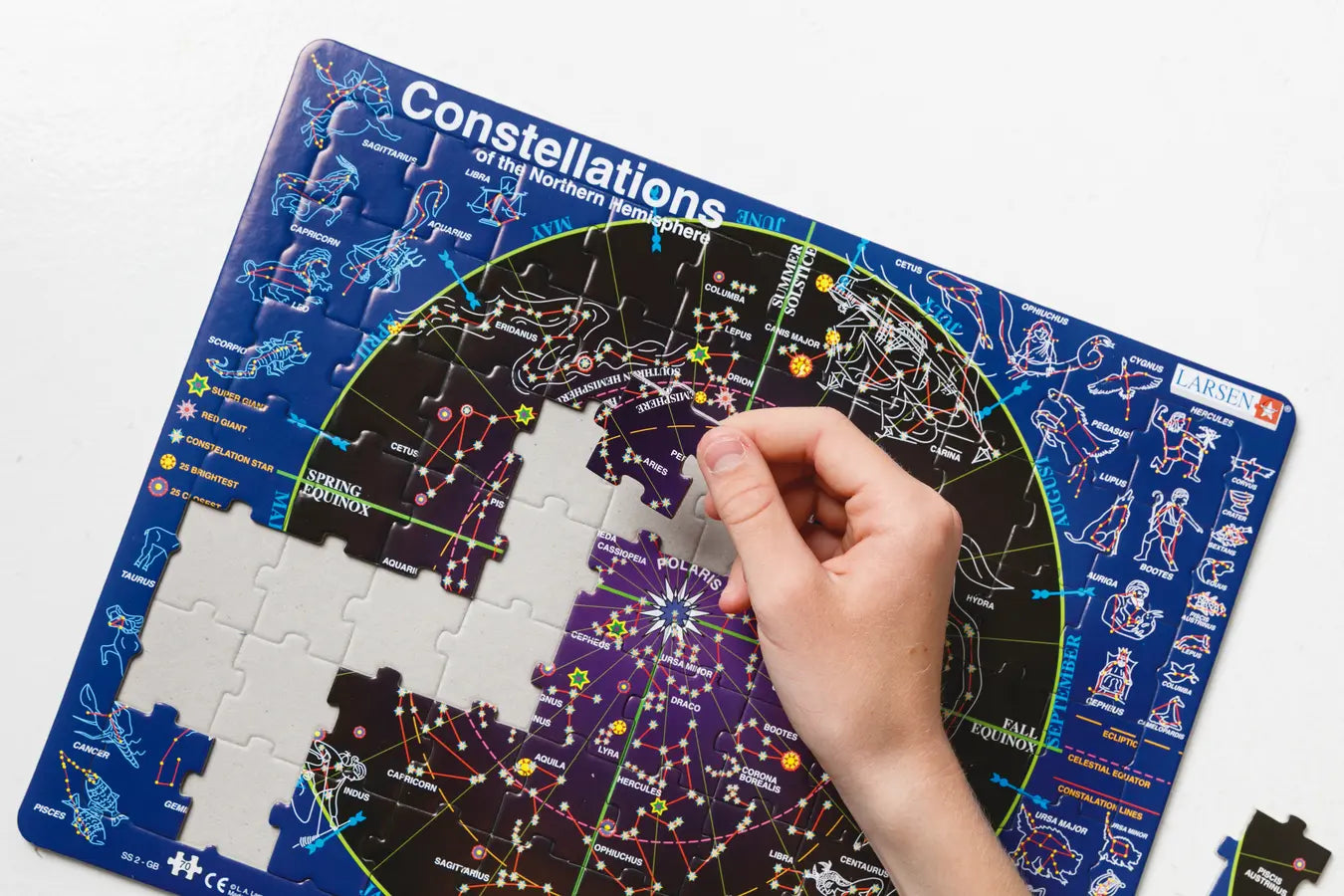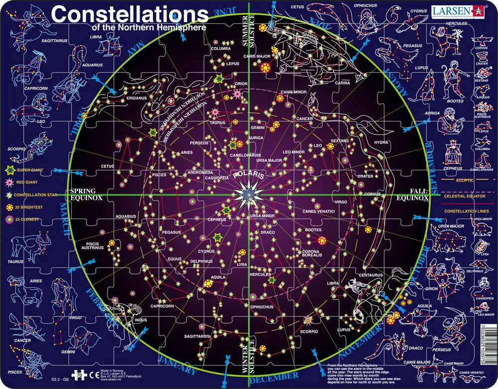 Dette illustrerende kartpuslespillet med stjernebilder viser 25 av de lyseste og nærmeste stjernene, de røde kjempene og superkjempene – alle fra den nordlige halvkule. Du finner stjernetegnene og årets tolv måneder. I tillegg til dette faller vinter- og sommersolverv vertikalt nedover midten, og vår- og høstjevndøgn er delt fra venstre mot høyre over midten. Dette detaljerte puslespillet leveres komplett med 70 tradisjonelle puslespillbrikker, og alle navnene på stjernebildene som er merket i puslespillet, er oppkalt etter noe i gresk mytologi. Den svarte sirkelen som er avbildet midt i puslespillet viser den mørke stjernehimmelen. Dette puslespillet passer ikke bare best for eldre barn, men både voksne med en stor interesse for stjerner vil synes det er svært fascinerende og opplysende.
