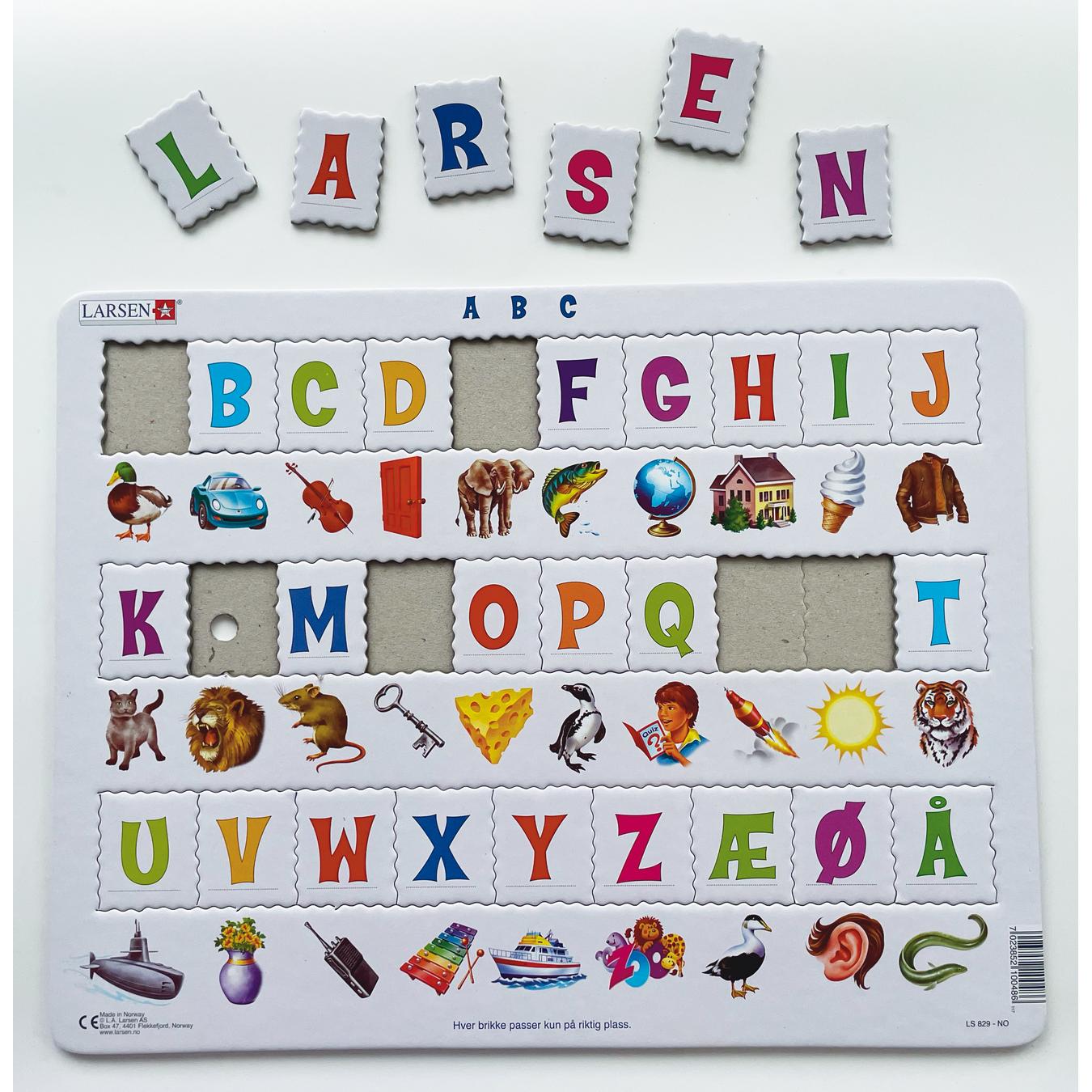 With this puzzle, the children learn the capital letters and the alphabet, and they learn to pronounce the first sound in words that begin with each letter. The puzzle has 29 pieces, and there is one letter on each piece. On the frame below each piece, there is a picture illustrating a word that begins with the letter on the piece. All the pieces are different, even though they look the same, they only fit in the right place. With a puzzle like this, the child can try and fail. They can work at their own pace, they concentrate and eventually they learn more and more. If the children themselves are interested, they can start by learning the letters from the age of three.