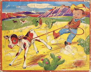 Puslespillet hadde en tegning av en cowboy med lassoen sin, og det var laget av tykk papp. Foreldrene mine la merke til at jeg brukte mye tid på å leke med dette puslespillet.