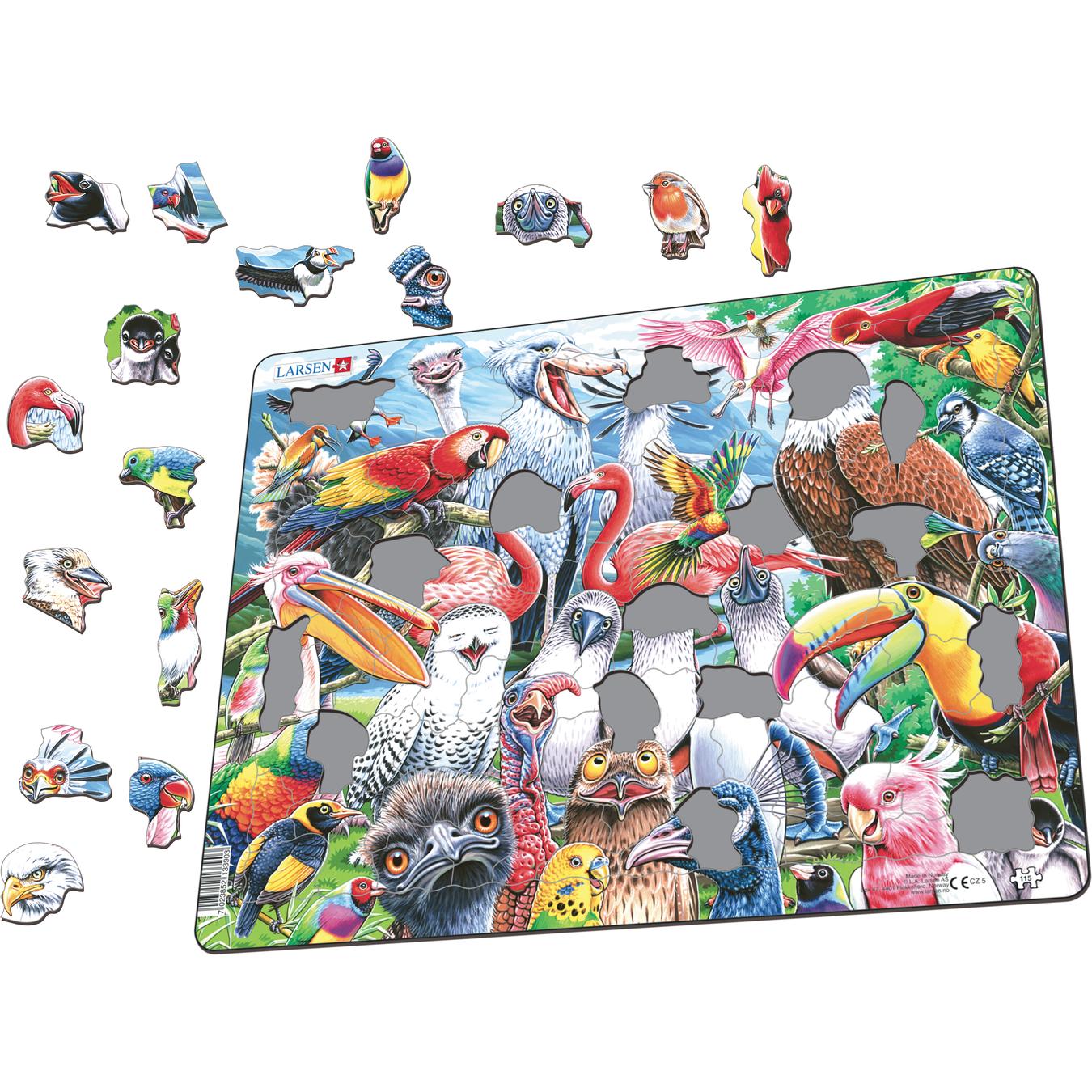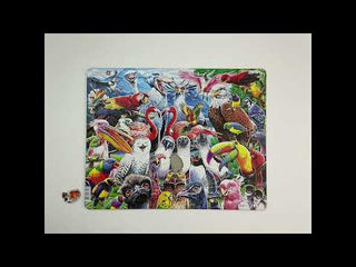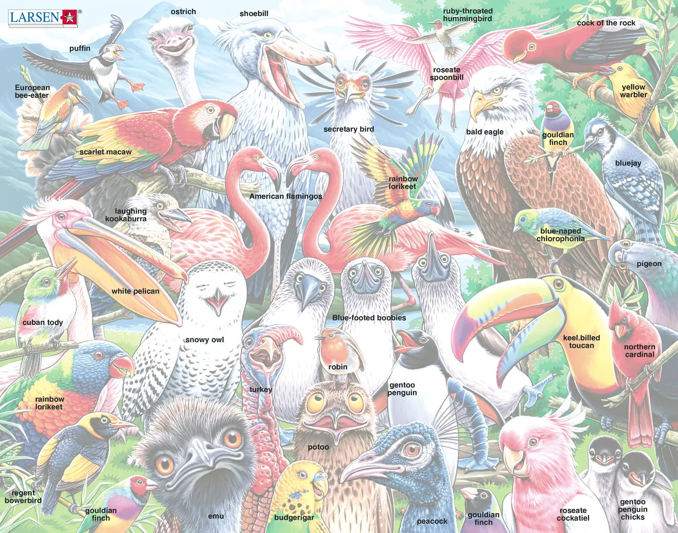 Her er en stor flokk med glade fugler. De har alle forskjellige farger og størrelser. Fugler spiser alt fra mark og fisk til frø, bær og mus. De to rosa fuglene midt i bildet er flamingoer. De trives best i store og grunne innsjøer med saltvann. Den store, hvite og brune fuglen til høyre for flamingoene er en havørn fra Nord-Amerika. Det er den eneste som ser misfornøyd ut, kanskje den ikke har fått noe fisk i dag? Dette puslespillet har 115 puslespillbrikker som er kuttet langs konturene av bildet, og det vil være en utfordring for folk flest. På noen puslespillbrikker er det bare en liten fugl, mens den store havørnen er delt inn i 10 puslespillbrikker.
