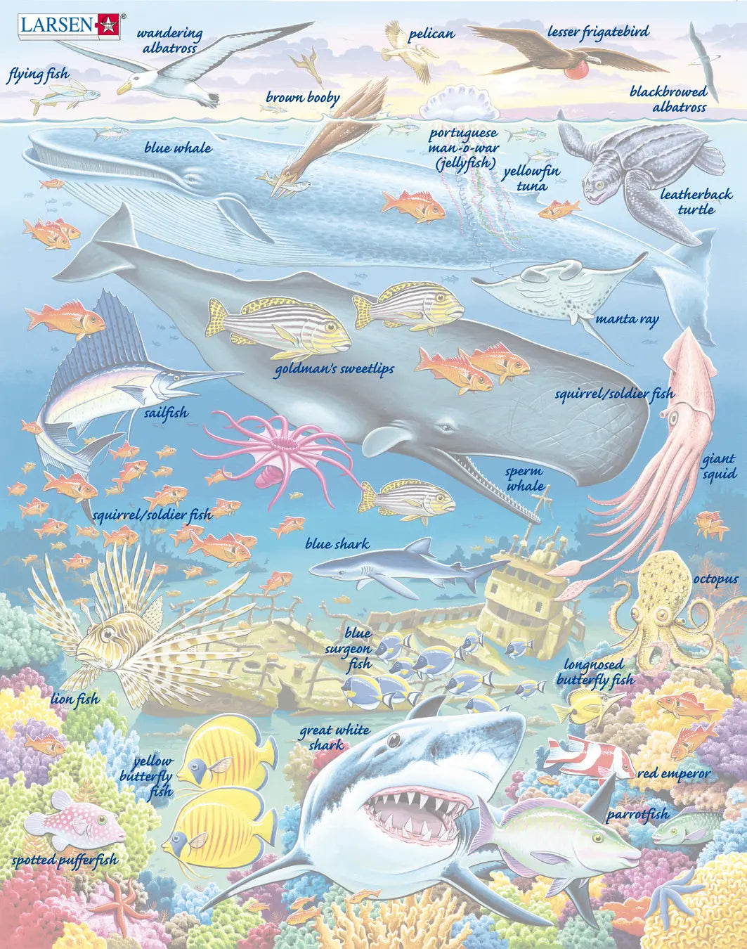 «Utforsk havet, dykk i bevegelse, mens fiskene vier all sin tid til å flyte ... Under havet.» Dette upåklagelige hvalrev-puslespillet har 66 brikker, best egnet for eldre barn. Dette Stillehavspuslespillet er vakkert illustrert med iøynefallende farger, med fokus på kreative koraller og alle fiskene under havet. Puslespillet har flygefisk, vandrende albatross, en pelikan, en mindre fregatt, en ekornfisk, en svartbrynet albatross, den store blåhvalen, hoppende maneter, gulfinnet tunfisk, en havlærskilpadde, en manta, en kjempeblekksprut, sebrafisk, blåhai, blå kirurgfisk, en blekksprut, en flekkblåsefisk, to papegøyefisker, den langnesede sommerfuglfisken og den store hvithaien omgitt av sjøstjerner og koraller. Kan du identifisere alle fiskene? Eller gjemmer det seg noen blant korallene.