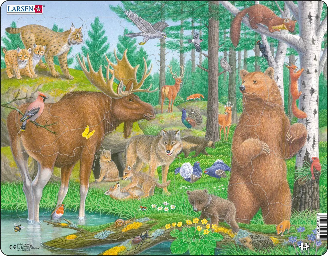 «Det finnes et bredt utvalg av dyr dypt inne i skogkledde områder. Her kan du finne elg og kronhjort som leter etter mat. En ulvefamilie leker lykkelig i nærheten av hiet sitt mens noen orrfugler spiser i nærheten. En bjørn og ungen hennes utforsker den nærliggende vannbekken. Hva er bjørneungen nysgjerrig på? En gaupe og kattungene hennes har kommet for å se hvor gøy alle har det. En hønsehauk flyr over hodet mens andre fugler og ekorn leker i trærne. Kan du finne reven som gjemmer seg bakerst i skogen?»