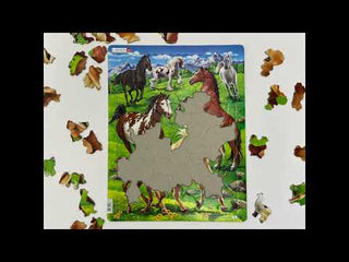 Dette symbolske puslespillet viser sju lekne hester som utholder frihet og natur over et åpent jorde. Med Svarte Skjønnhet og den hvite englehesten på motsatte sider samles de brune hestene og galopperer lekent rundt hverandre. Med en gul og svart sommerfugl som flagrer over gresset, dekker store klumper med gjørme gresset der hestene har galoppert overentusiastisk. Puslespillet leveres komplett med 65 brikker, designet for eldre barn. Noen av puslespillbrikkene er passende formet som en lama, en sommerfugl, en banan, en kopp, en pingvin og en fisk. Dette puslespillet med hestetema vil hjelpe barnet ditt med å utvikle finmotorikk, kognitive ferdigheter og god hukommelse.