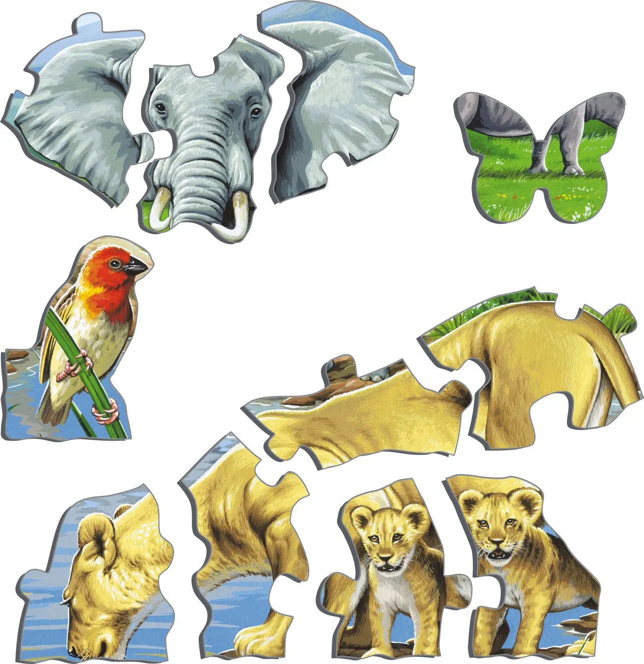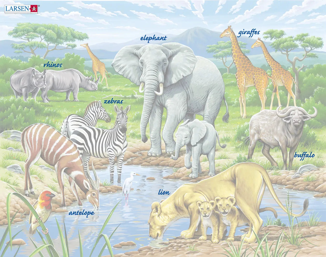Vannhullet på en afrikansk savanne er alltid et spennende og populært sted å besøke for mange dyrearter. Elefanter dukker alltid opp og koser seg med å plaske i vannet. Bøfler, antiloper og sebraer besøker også vannet for å få seg noe å drikke i løpet av den varme delen av dagen. Kan du finne løveungene som har kommet for å leke? Selv et neshorn eller to koser seg med de grønne plantene vannet gir. Hvor mange sjiraffer beiter langt ute fra vannkanten? Med 65 skreddersydde brikker er dette puslespillet perfekt for litt eldre dyreelskende barn. Fuglen nederst i venstre hjørne er 'kardinal quelea'.