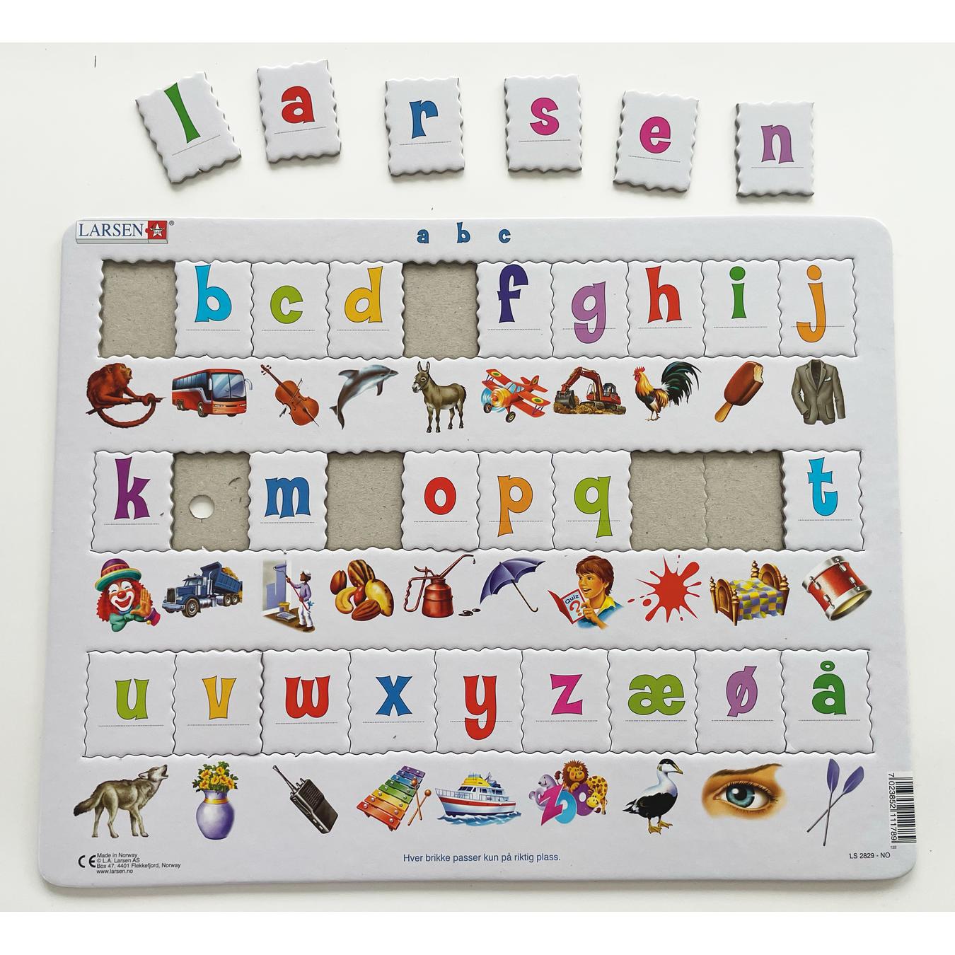 Med dette puslespillet lærer barna de små bokstavene og alfabetet. Puslespillet har 29 brikker, og det er en bokstav på hver brikke. På rammen under hver brikke er det et bilde som illustrerer et ord som begynner med bokstaven som står på brikken.