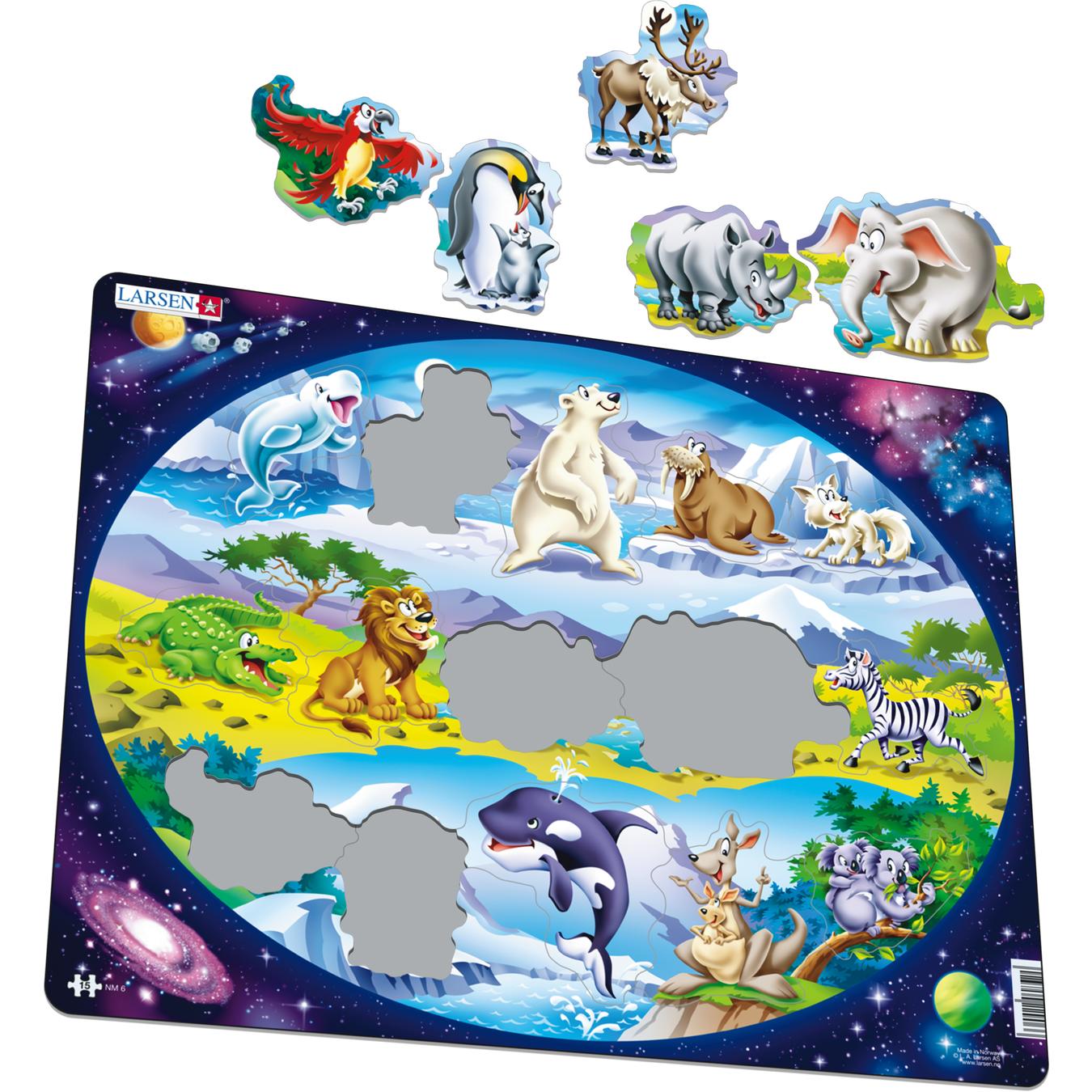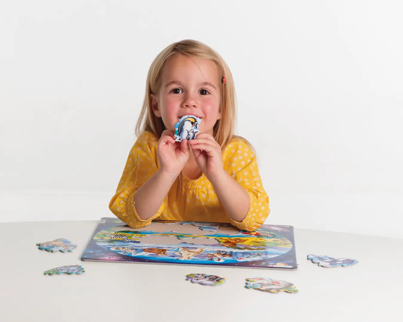 Kan du gjette hvor dyrene kommer fra med dette dyrepuslespillet verden rundt? Dette puslespillet med 15 brikker er perfekt for de minste, siden brikkene er større med 5 brikker per rad. Det er laget for barn som ennå ikke har utviklet den motoriske presisjonen i hendene. Hver brikke ligger stødig i sin egen ramme, slik at barnet kan plassere hver brikke uten å støte borti og flytte andre brikker vekk fra plassen sin.
