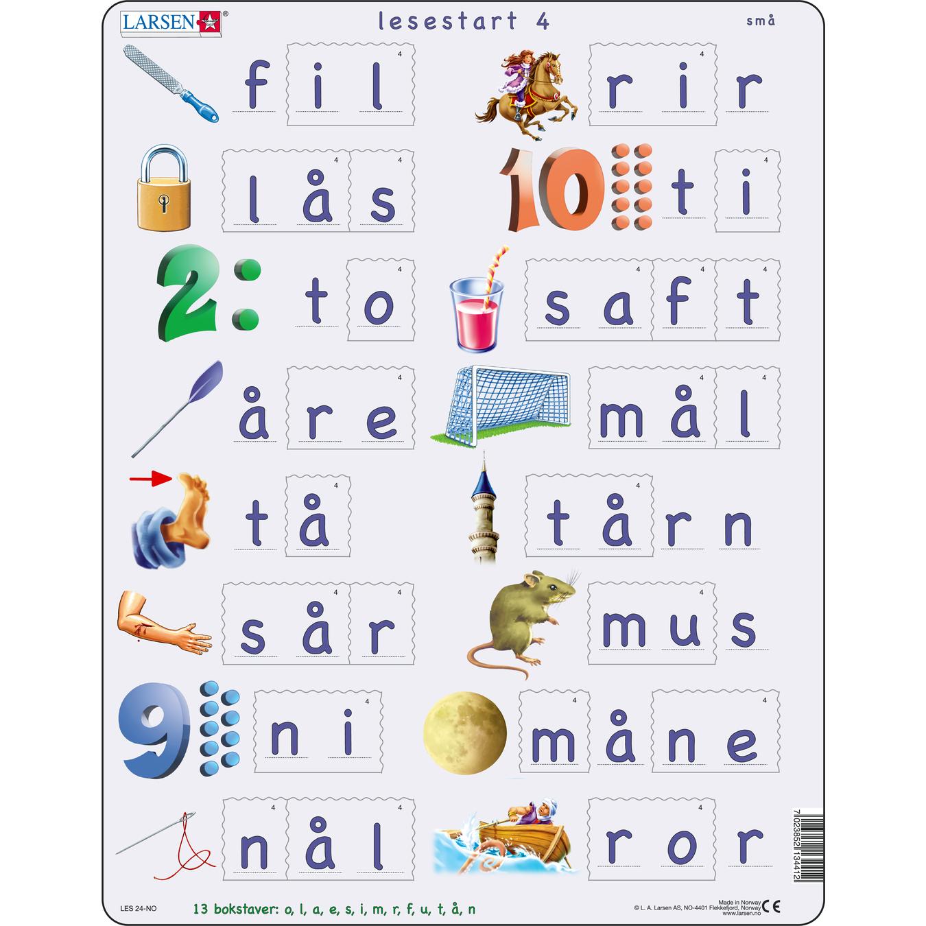LESESTART 24 har 23 brikker med en bokstav eller stavelse på hver brikke. Det er 13 av de samme bokstavene som i LESESTART 3. Sett brikkene sammen for å lage ord som matcher de 16 tegningene på rammen. Ikke alle bokstavene er på brikkene, noen er festet til rammen og er nyttige for personen som legger puslespillet.