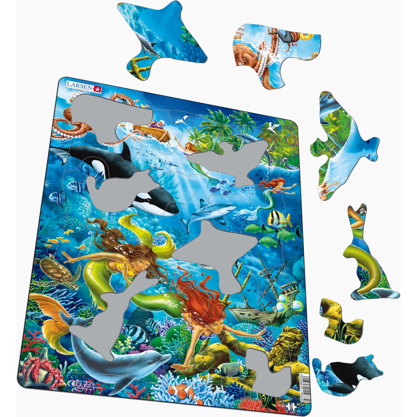 Vi har ingen problemer, for livet er bare bobler under havet. Dypt nede i dette dekorative og illustrerende puslespillet finner du alle skattene og juvelene. Puslespillet viser fire dyrebare havfruer som utforsker hjemmet sitt. En havfrue strekker seg over vannet og rekker etter menneskene. Kan hun be om selskap eller true dem med å holde seg unna? I havet finner du en hvithai, en spekkhogger, en havskilpadde, en stor rosa blekksprut, en delfin, måker og en rekke eksotiske fisker. De fargerike korallene ligger pent under havfruene som et teppe mot gulvet. Over vannet kan man se en gruppe tropiske palmer. Dette puslespillet kommer komplett med 32 brikker, hvor noen av brikkene er formet som en katt, en fugl, en kanin og en ornament. Hva kan ornamenten være?
