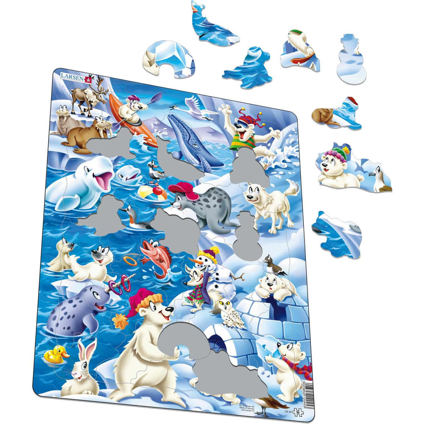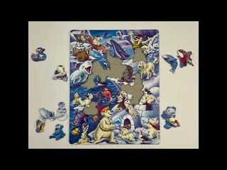 Isbreer, igloer og isflak dekker denne skildringen av en tegneserielignende arktisk isaffære. I dette lekne arktiske ispuslespillet er havet fylt med arktiske dyr, inkludert en arktisk hare, et reinsdyr, måker, sel, hvalross, fjellrev, narhval, to hvithvaler, knølhval, snøugle, seks isbjørner og en rosenfisk. Dyrene nyter en frisk dukkert i havet, mens isbjørnene samler isblokker for å fullføre igloene. En isbjørn koser seg med en dag med kajakkpadling, mens de andre kjører snowboard nedover fjellet. Puslespillet leveres komplett med 36 brikker, som er kreativt kuttet og formet som en iglo, en sel, en hval, en ulllue, en and, en isbjørn og en snømann. Både yngre og eldre barn kan like dette puslespillet som vil hjelpe med å utvikle utviklingsmessige, kognitive og finmotoriske ferdigheter.